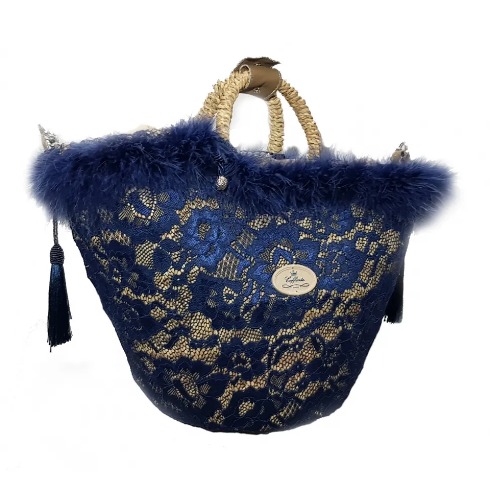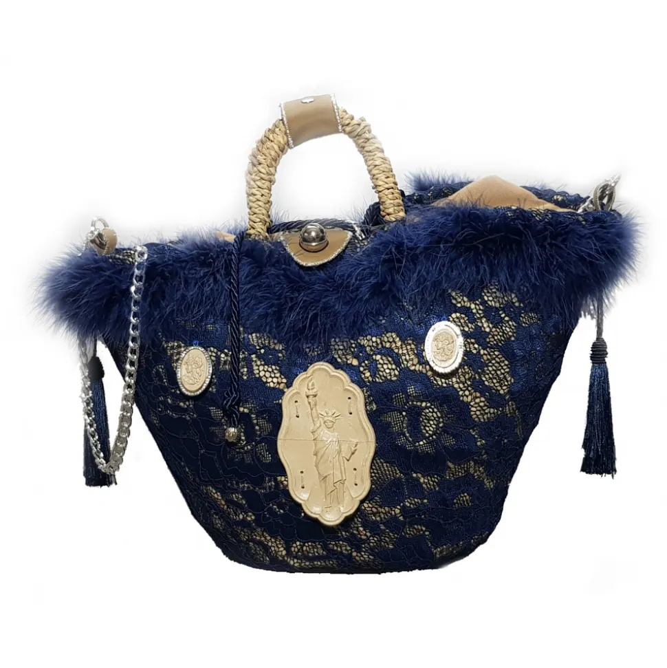 Upholstery in blue lace, trimmings with blue feathers, inside in fine fabric with bag closure; bell closure and eco-leather handles; central stone insert with the image of the statue of liberty, adorned on the sides with as many stone inserts with the image of cameos with edges enriched with rhinestones; tassels hanging on the sides, stone brand with the word “COFFARTE” and removable chain shoulder strap.