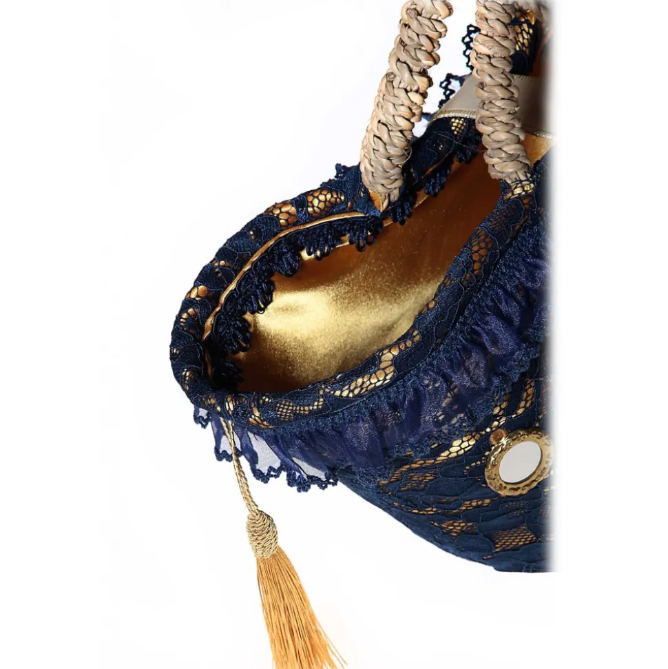 Coating golden satin and lace blue central cameo stone, button closure with faux leather flap, typical Sicilian gilded mirrors.