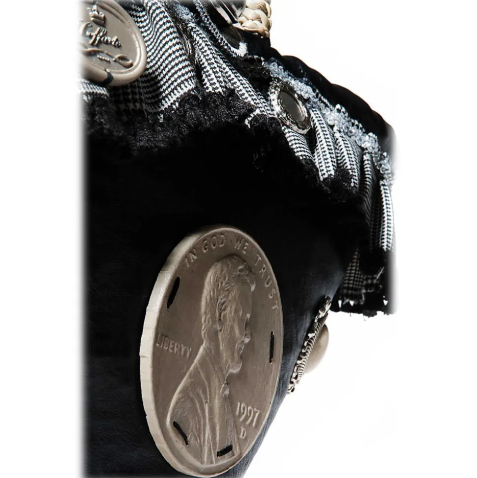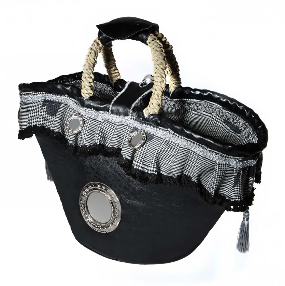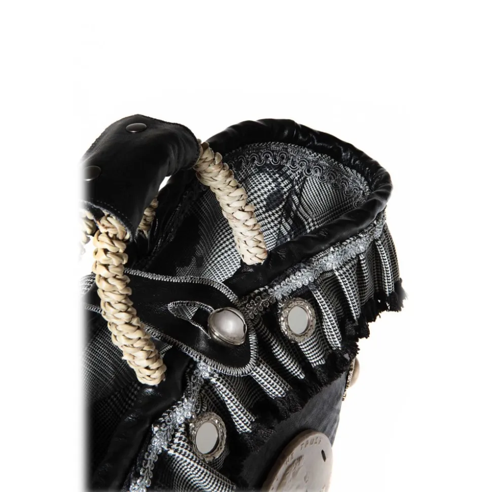 Cladding eco black leather, crumpled and fringe of hand-stitched edge in houndstooth fabric, pleated with central insert and lincon relief, two oval in metal frame to the sides; coffarte logos are sewn stone on leaps and closing bell.