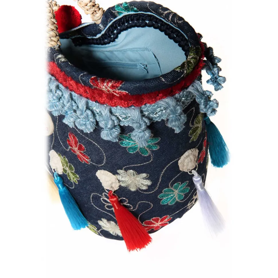Coating in jeans with embroidered flowers and No. 8 heads of stone lions with colored tassels sewn specifically on the bag; fine fringe onion hand sewn on the edge of the crow’s nest; Closing bell-bottom and faux leather with embroidered logo coffarte.