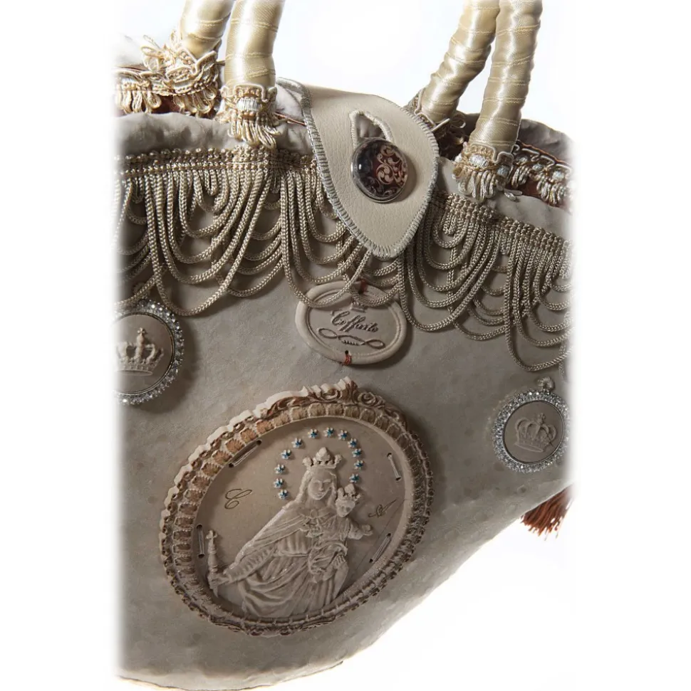 Coating fine stretch fabric, leather effect and sequins; fringe fall of rings, insert Baroque frame with Santa Maria Regina engraved on stone of Comiso, handles with satin ribbon and pearl button closure, elegant.