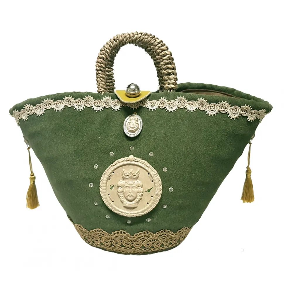 Upholstery in fine velvety fabric, with trimmings decorated with weaves; stone inserts on the sides depicting the Head of Lions with attached hanging tassels; bell lock, pocket for valuables sewn into the internal lining; central stone insert with dark brown image and circular zircon decorations. The Coffa Moro Sicily represents a traditional classic style and is adaptable at any time of the day.