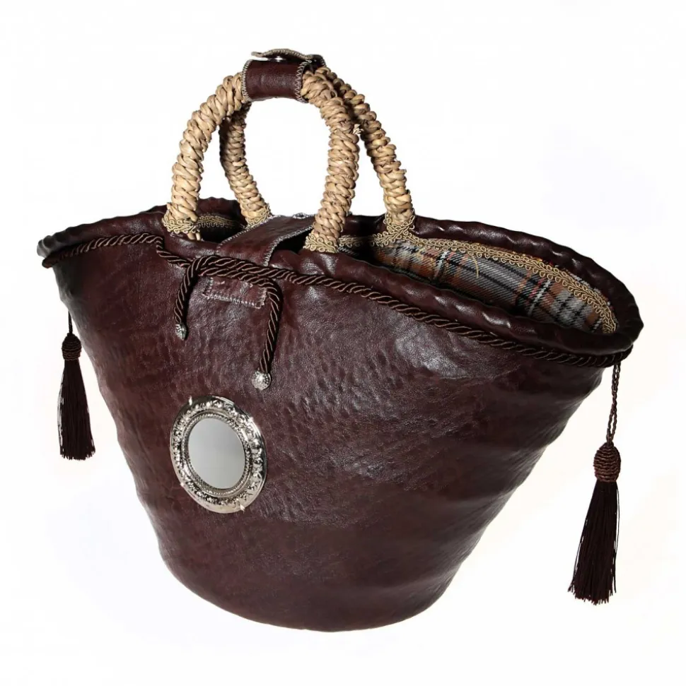 Coating faux brown leather brown side tassels with central insert, trinacria engraved on stone of Comiso and No. 2 side pendants with stone decorations; button closure and internal plaid fabric.