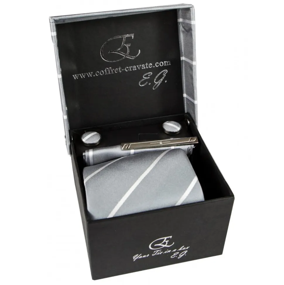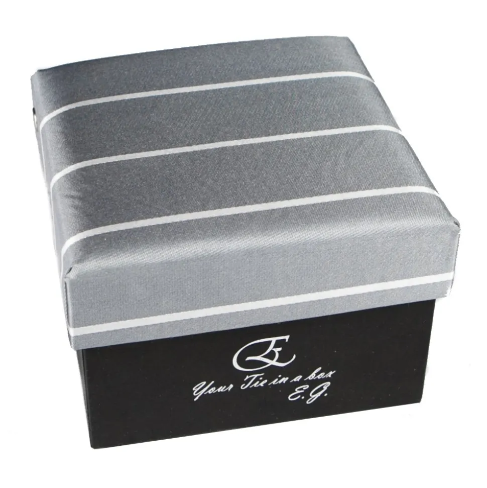 Simplicity and elegance are the key elements of this single stripe tie that will allow for multiple color parings.In its luxury box you can find two cuff-links and a pocket square, all of the same motif of the tie. Not forgetting the polished steel clip for the final touch. Based on an original idea, the motif and tie box are labeled under the brand E.G. that is represented on the box with an elegant signature discreetly located on the side of the box.