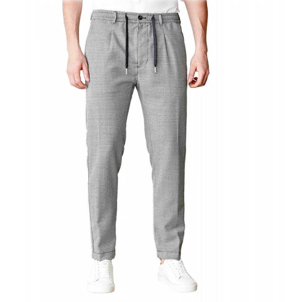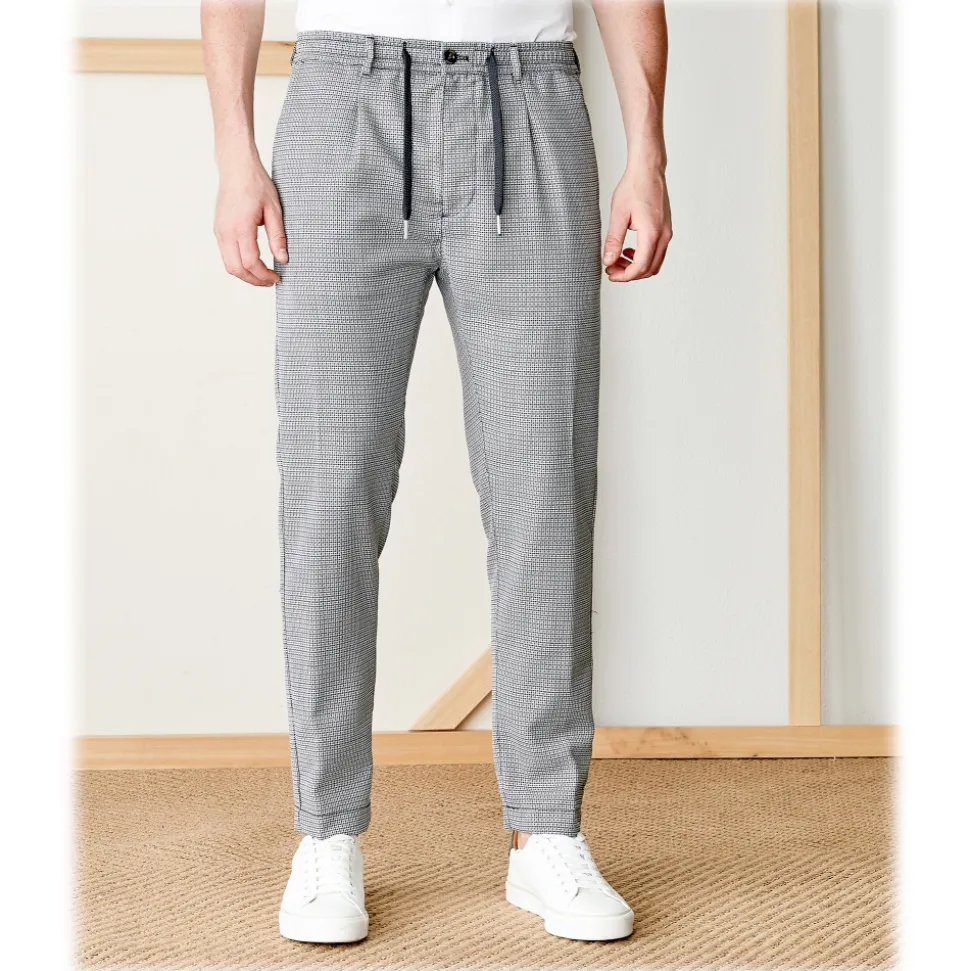 The fresh wool, a fabric with a particular thermoregulatory property and a clean and elegant appearance, is enhanced by designs that give movement and originality. The Carrot fit with a 17 cm trouser-legs bottom and sewn pinces confers the maximum comfort to this updated and sophisticated model.