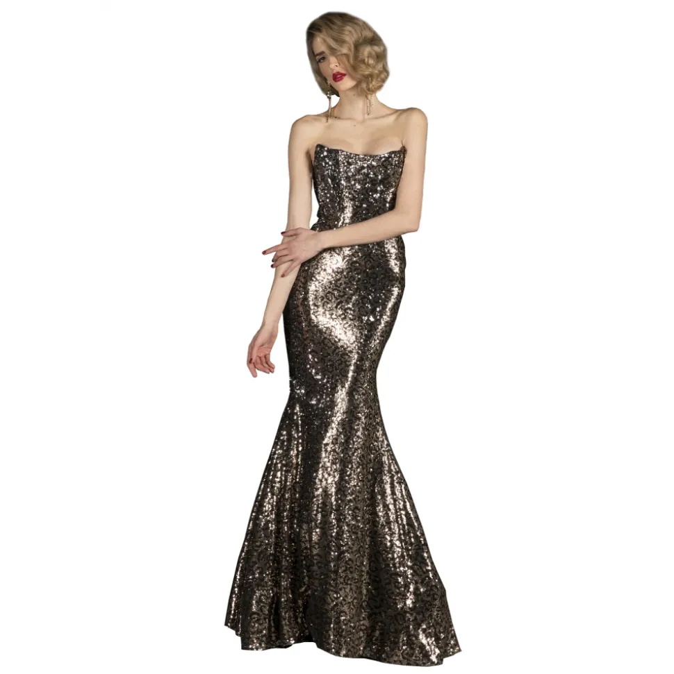Long mermaid bustier dress in full animalier sequins. Michelle Hunziker Official.