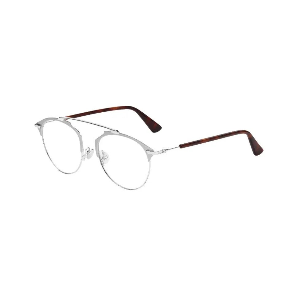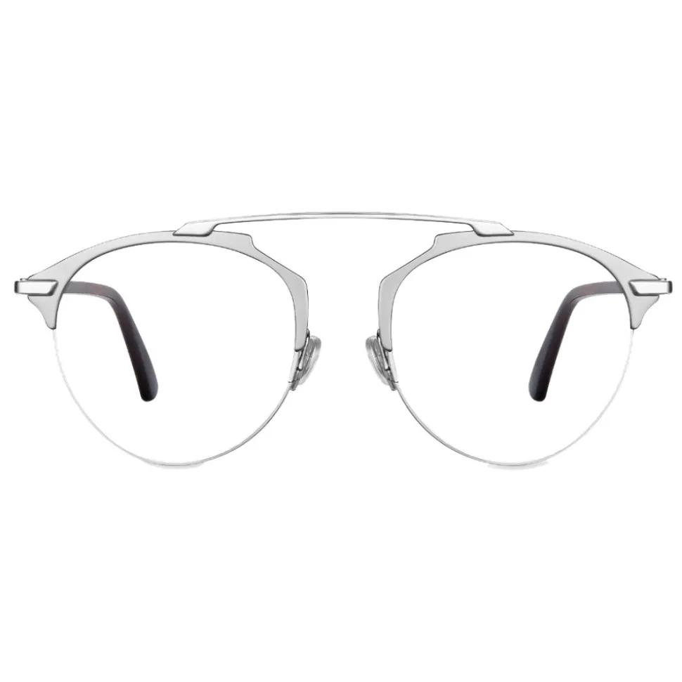 The DiorSoRealO glasses revisit the shape of the iconic DiorSoReal model in a vision version. Flat and ultra-thin, the golden metal emphasizes the exclusive architectural design of the model, accentuated by the play of contrasts between glossy and opaque. The thin temples are in black acetate and silver metal.