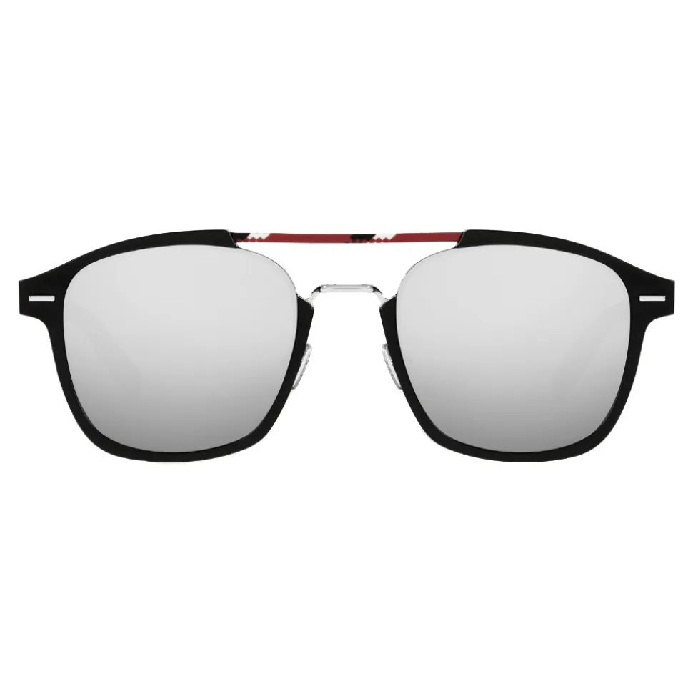 Rectangular “AL13.13” sunglasses. The technical frame combines a black aluminum front, an emblematic material from the Dior Homme collections, and a double bridge with a red, black and white pattern. The ultra-flat lenses are applied flush with the frame. The black acetate temples are adorned with Dior Homme’s scar.