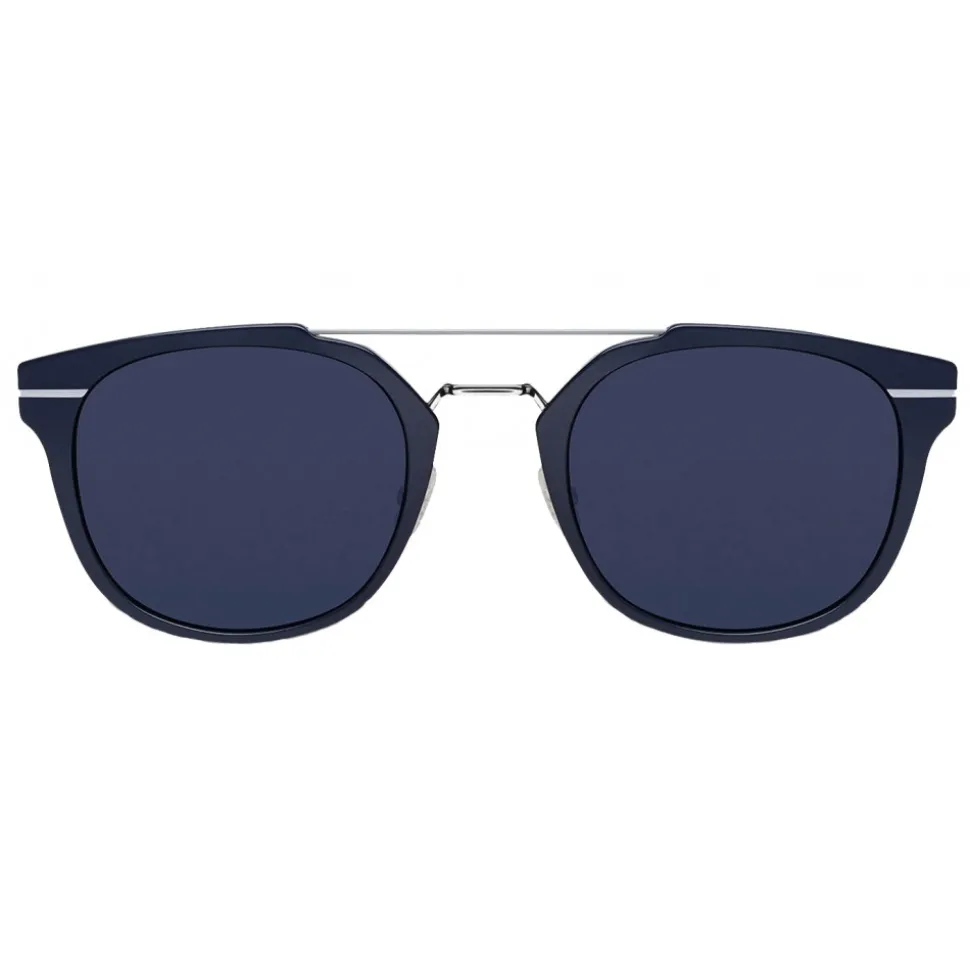 With an opaque navy blue aluminum front and thin temples in black acetate, the “AL13.5” sunglasses are inspired by the minimalist style of Dior Homme. The pantos shape is enhanced by gray contrasting details that interpret the emblematic scar of Dior Homme.