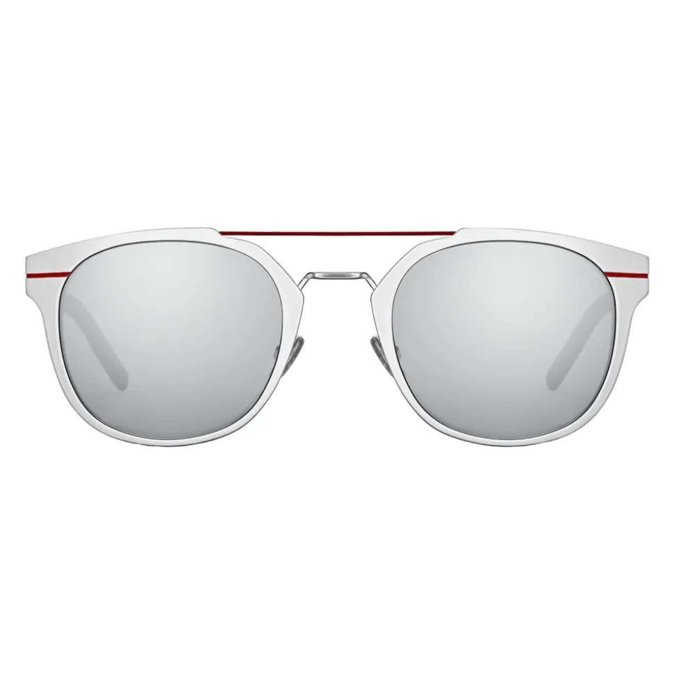 With a matt silver aluminum front and thin temples in black acetate, the “AL13.5” sunglasses are inspired by the minimalist style of Dior Homme. The pantos shape is enhanced by red contrast details that interpret the emblematic scar of Dior Homme.