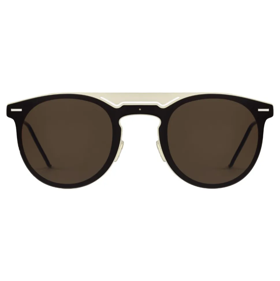 “Dior0211S” sunglasses with rounded shape. The front of these revisited goggles is composed of a bridge in light gold metal embellished with the emblematic scar of Dior Homme, which follows the shape of brown lenses. The temples in light gold metal let us glimpse the emblematic guilloché motif of the Maison.