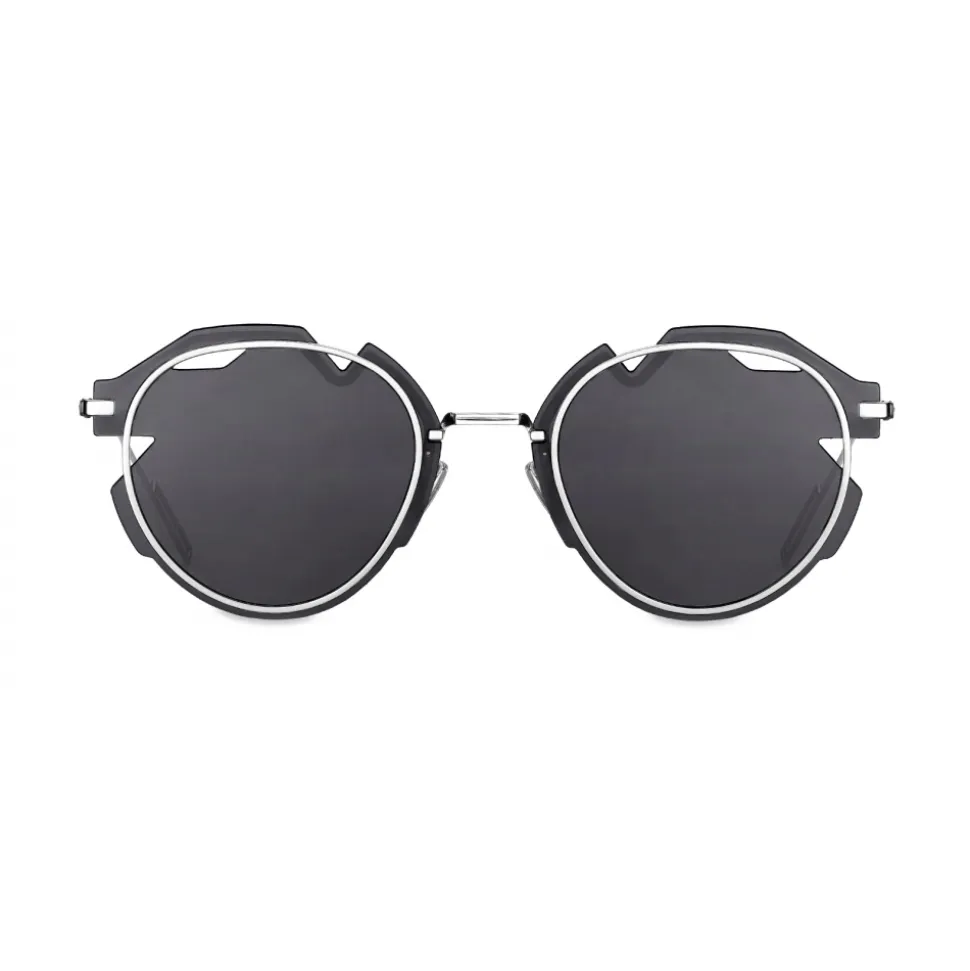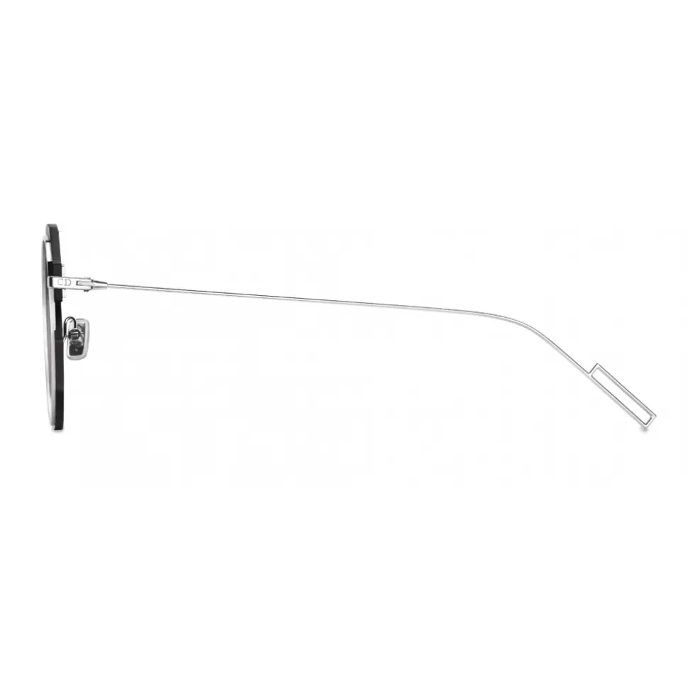 The DiorBreaker sunglasses from the Summer 20 fashion show have a fragmented silhouette, inspired by the Dior Future Relics Collection created in collaboration with Daniel Arsham. Simulating a product that has eroded over time, the cracked and openwork accents lend unexpected detailing to the pantos shape. Ultra-flat dark gray lenses sit within the silver metal frame, utilizing sophisticated construction techniques.
