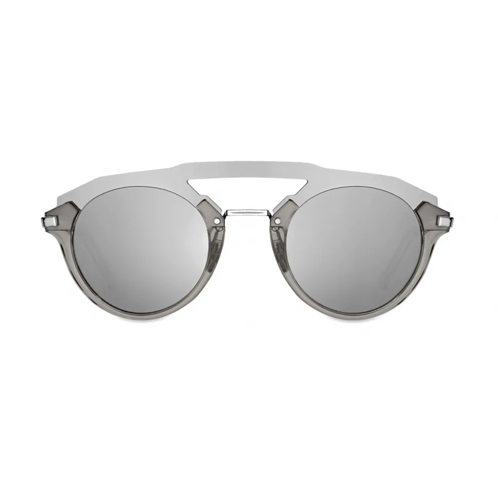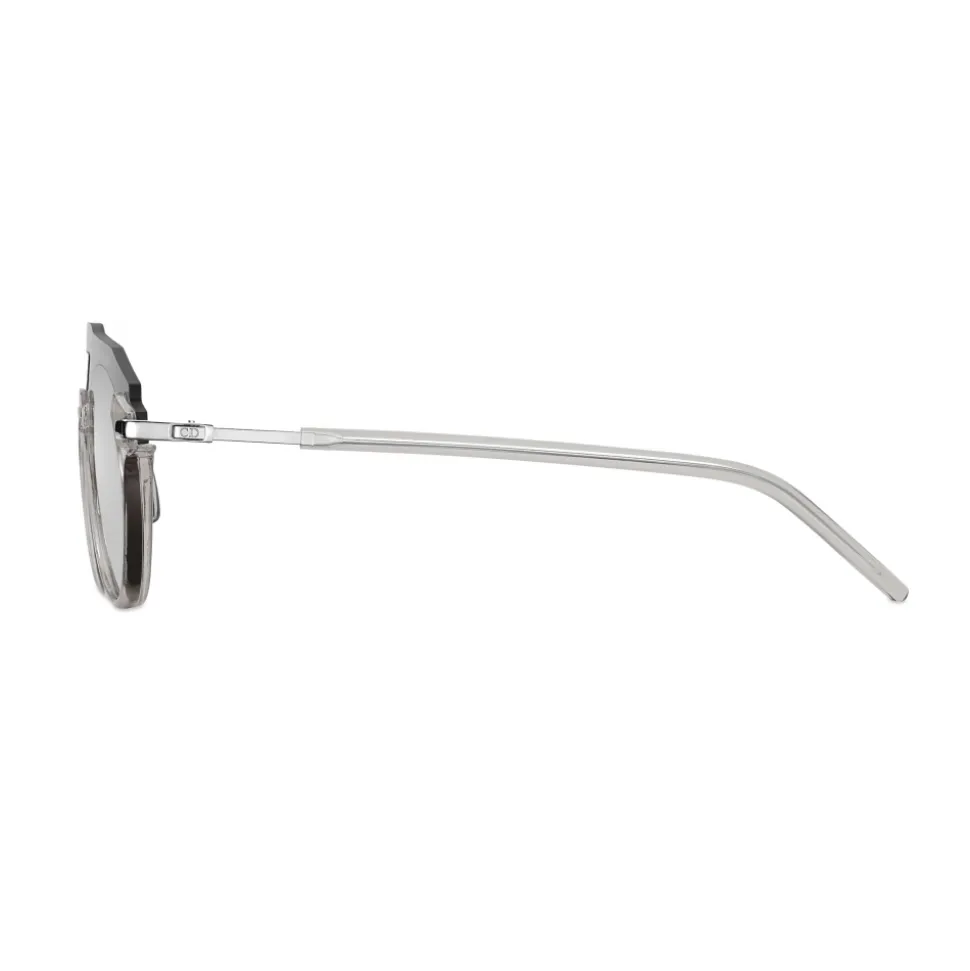 The DiorFuturistic sunglasses have a pilot silhouette, inspired by the visionary theme of the Summer 2020 Collection. The mask-like shape has silver mirrored lenses with a translucent gray acetate frame. The graphic, laser-cut construction reveals a double bridge and the thin silver metal temples spotlight a subtle ‘CD’ logo. These statement-making sunglasses lend futuristic flair to any look.