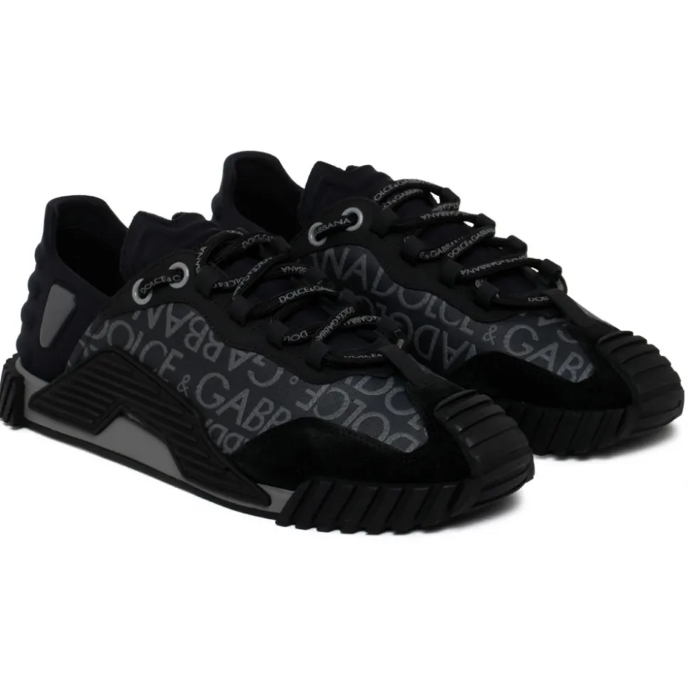 Dolce & Gabbana Black and Grey Calf Leather NS1 Sneakers. Black and grey calf leather sneakers, ombré effect, jacquard logo motif, panelled design, front lace up fastening, round toe, flat rubber sole.