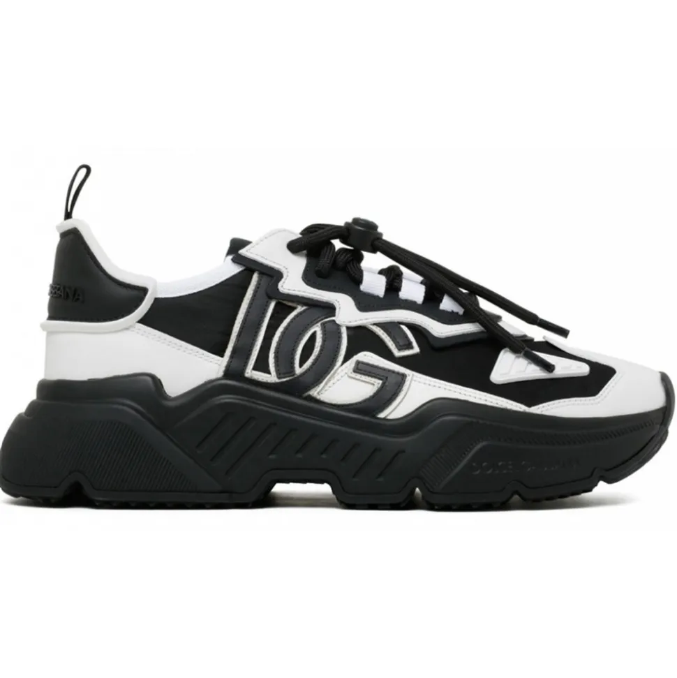 Dolce & Gabbana Black and White Leather Day Master Sneakers. Black and white leather sneakers, two tone design, front toggle fastening, logo patch at the tongue, logo patch to the side, branded heel counter, round toe and oversize rubber sole.