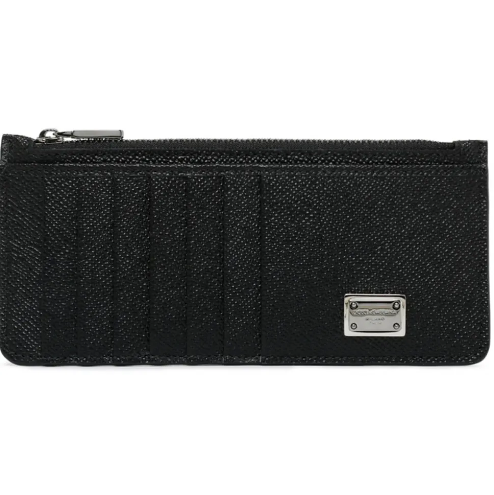 Dolce & Gabbana Black Calf Leather Wallet. Black calf leather wallet, silver tone logo plaque, card slots, top zip fastening, grained texture.