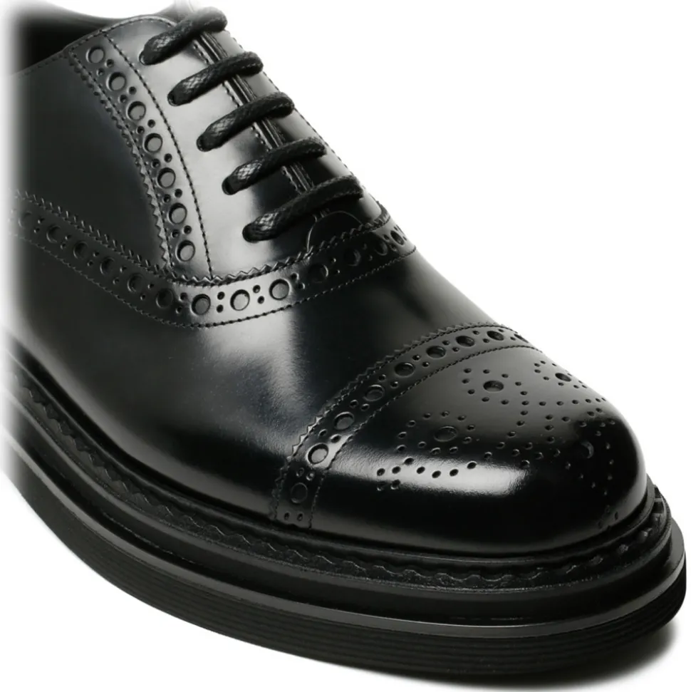 Dolce & Gabbana Black Francesina Derby Shoes. Black calf leather derby shoes, front lace up fastening, brogue detailing, brushed finish, round toe and rubber sole.