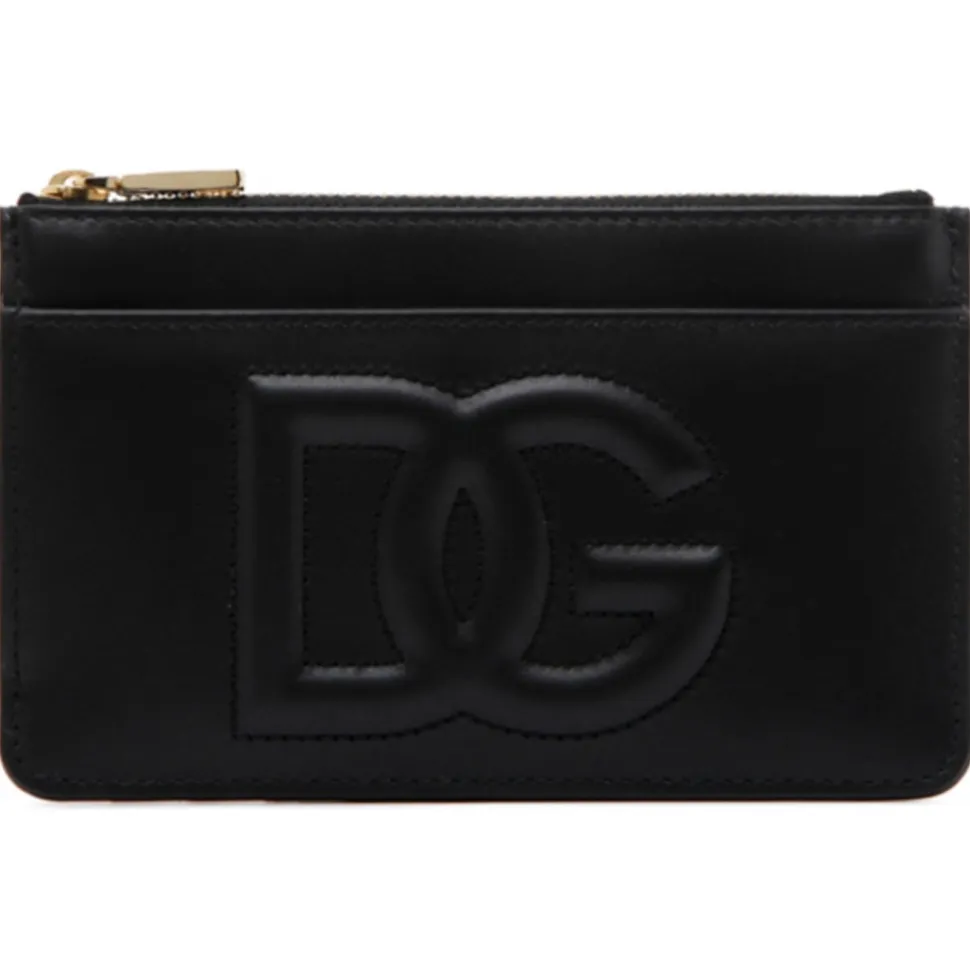 Dolce & Gabbana Card Holder Black, leather card holder, embossed leather logo, one zip pocket, one slot pocket on the front