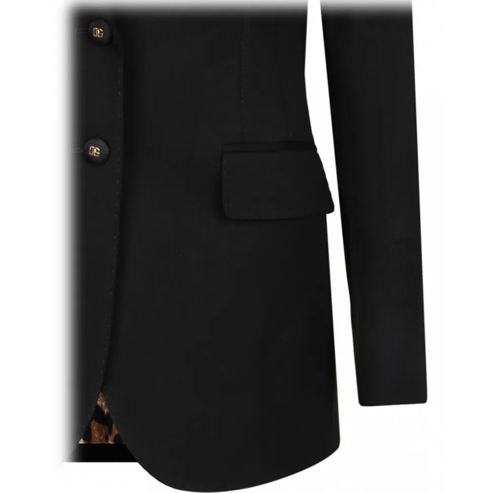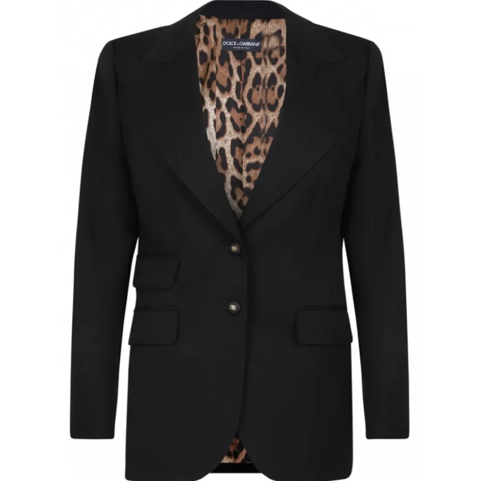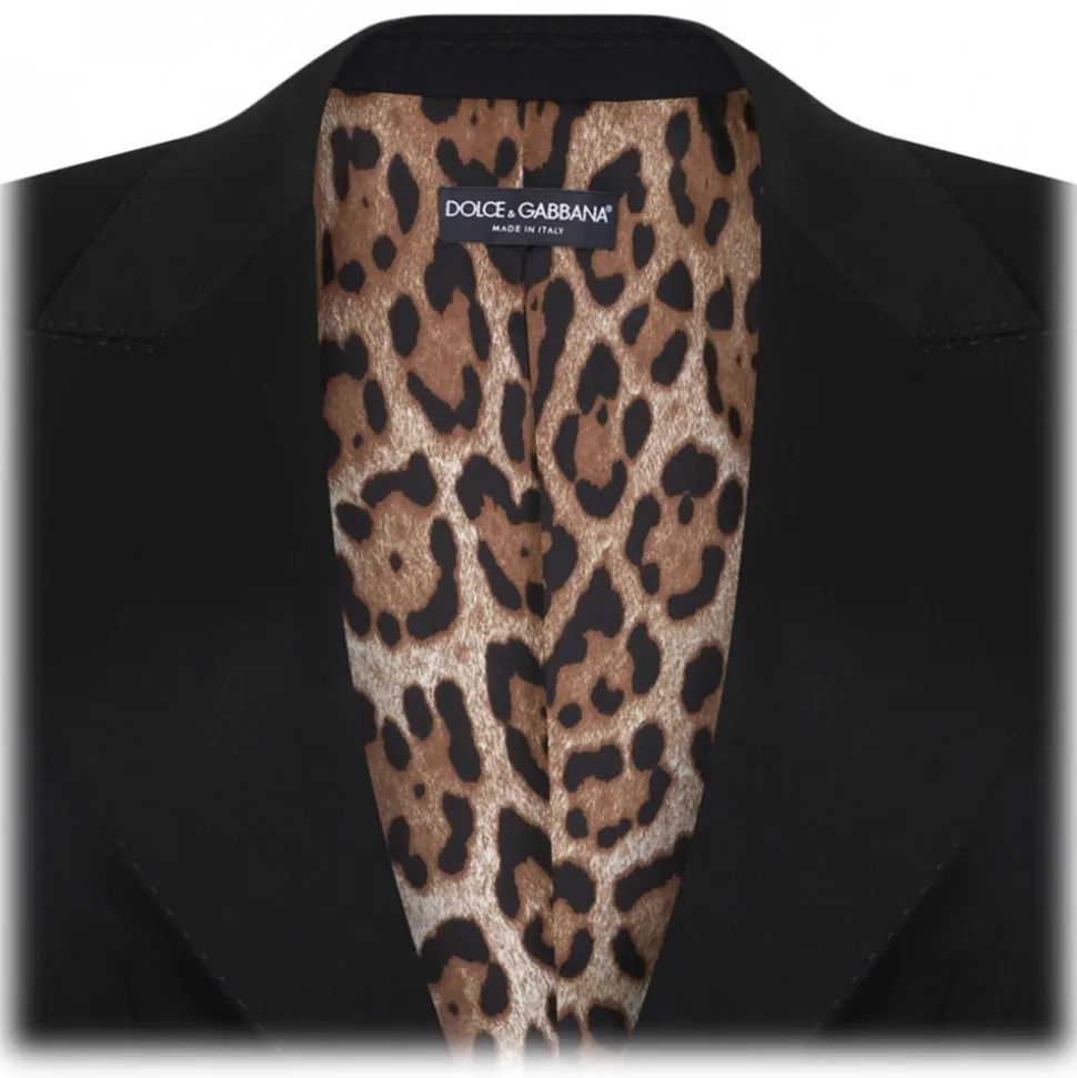 Dolce & Gabbana Black Turlington Jacket. Black Turlington jacket in gabardine with stitching, single breasted, peak lapels. Long sleeves, double pocket, flap pockets. Lined in leopard-print stretch satin and closure with cannett