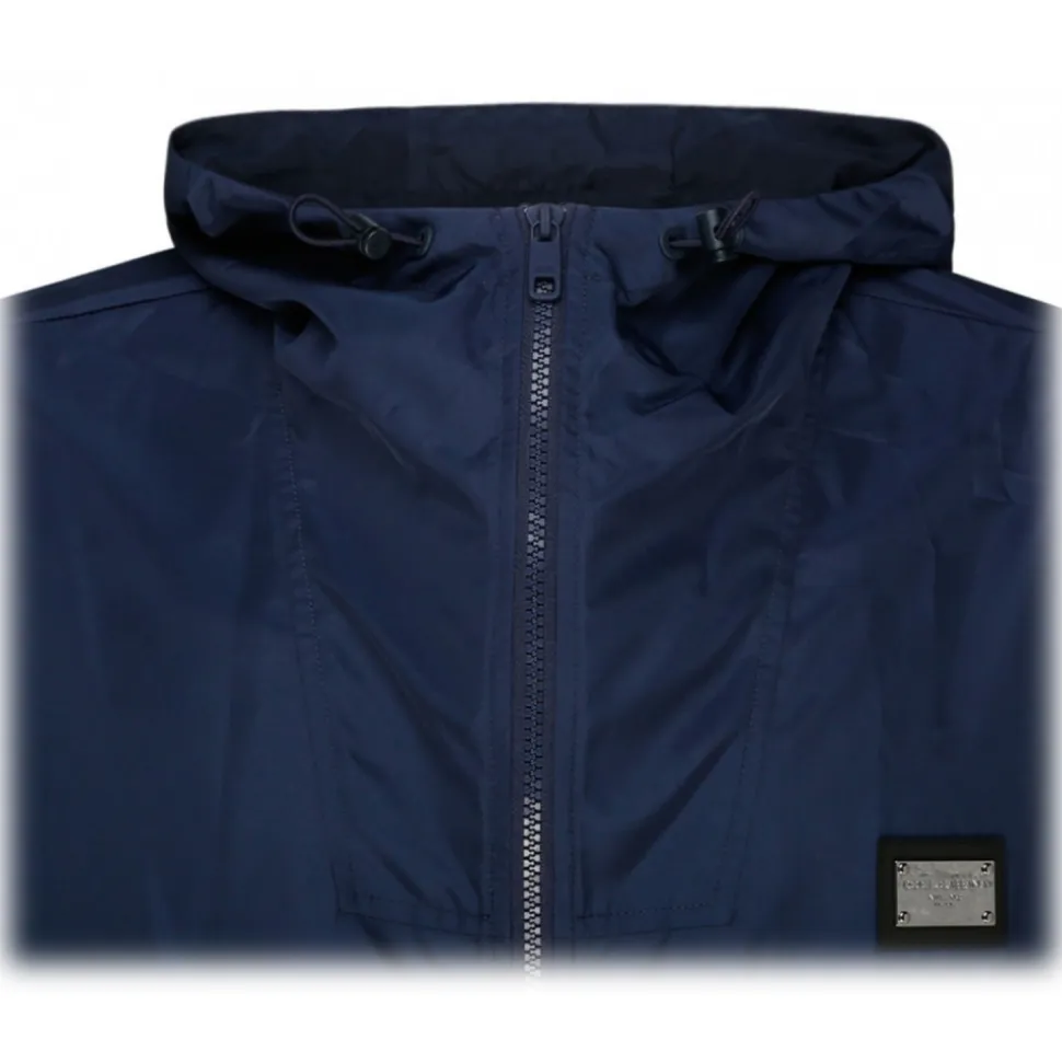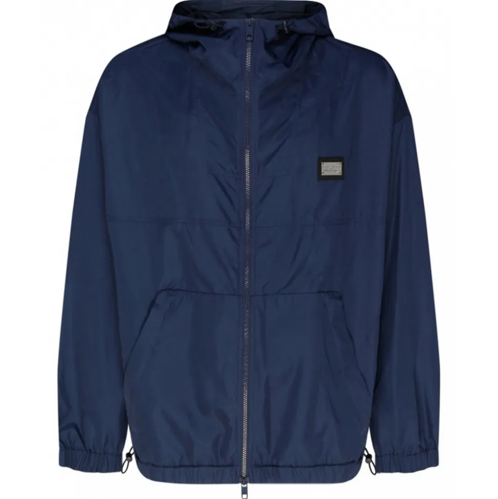 Dolce & Gabbana Blue Logo Plaque Jacket. Blue jacket, classic hood, logo plaque to the front, front zip fastening and long sleeves.