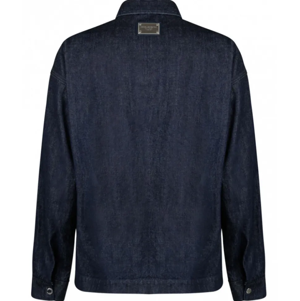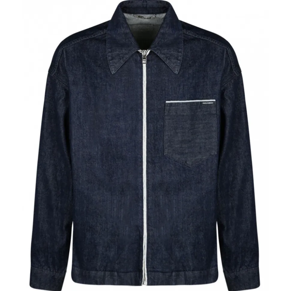 Dolce & Gabbana Blue Selvedge Denim Blouse With Zipper, kent collar, zipper fastening and long sleeves. Press-stud fastening on cuffs. Patch breast pocket and side pockets.