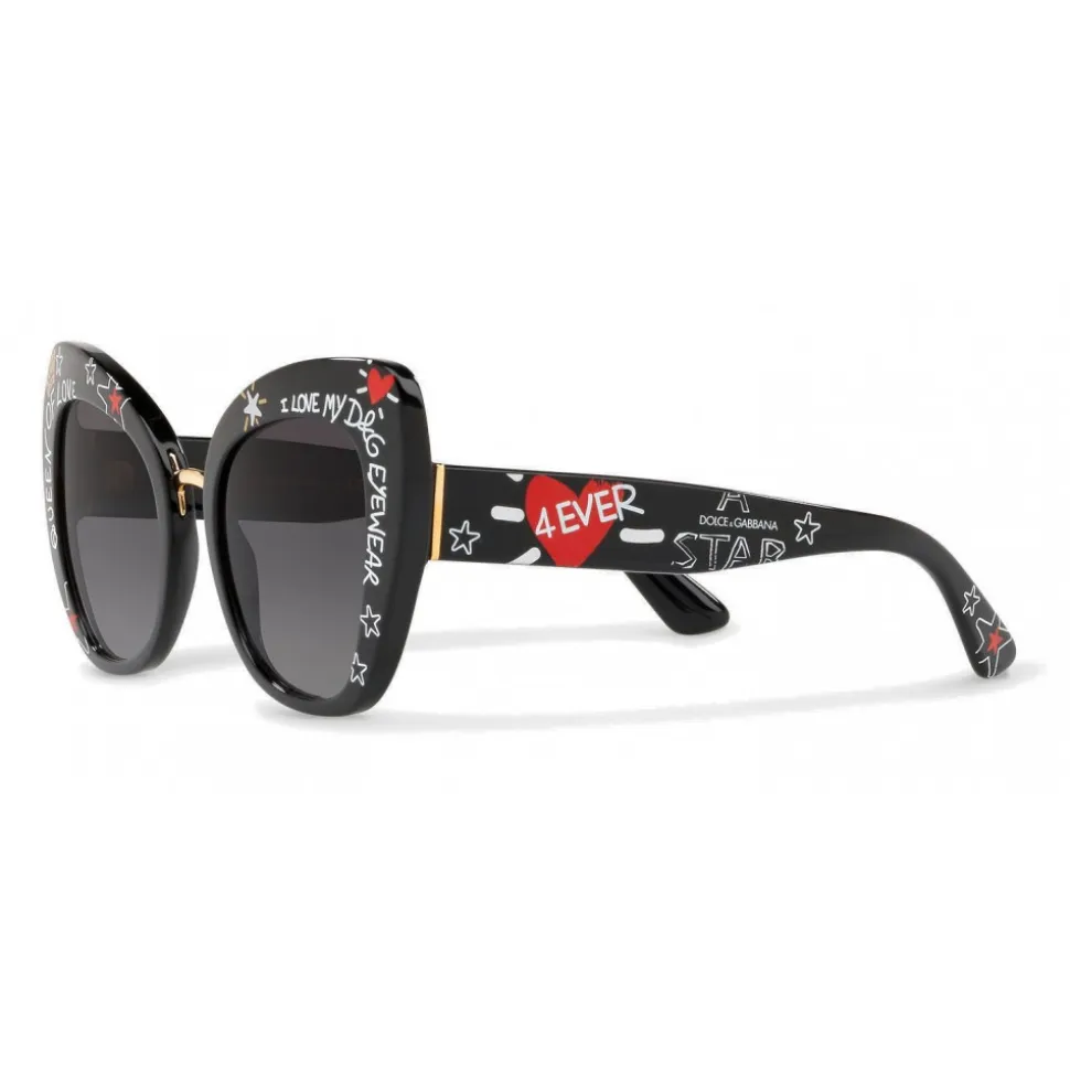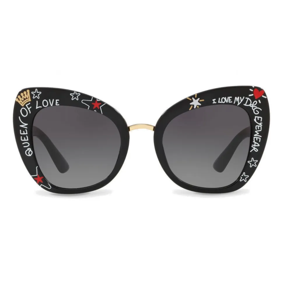 Butterfly shaped acetate sunglasses with a metal bridge characterized by graffiti printing. Auctions personalized with the Dolce & Gabbana logo.