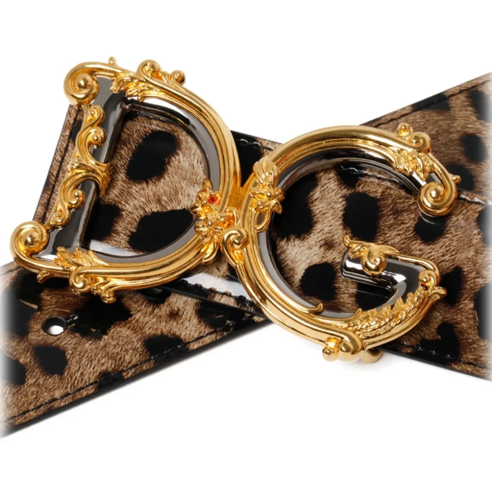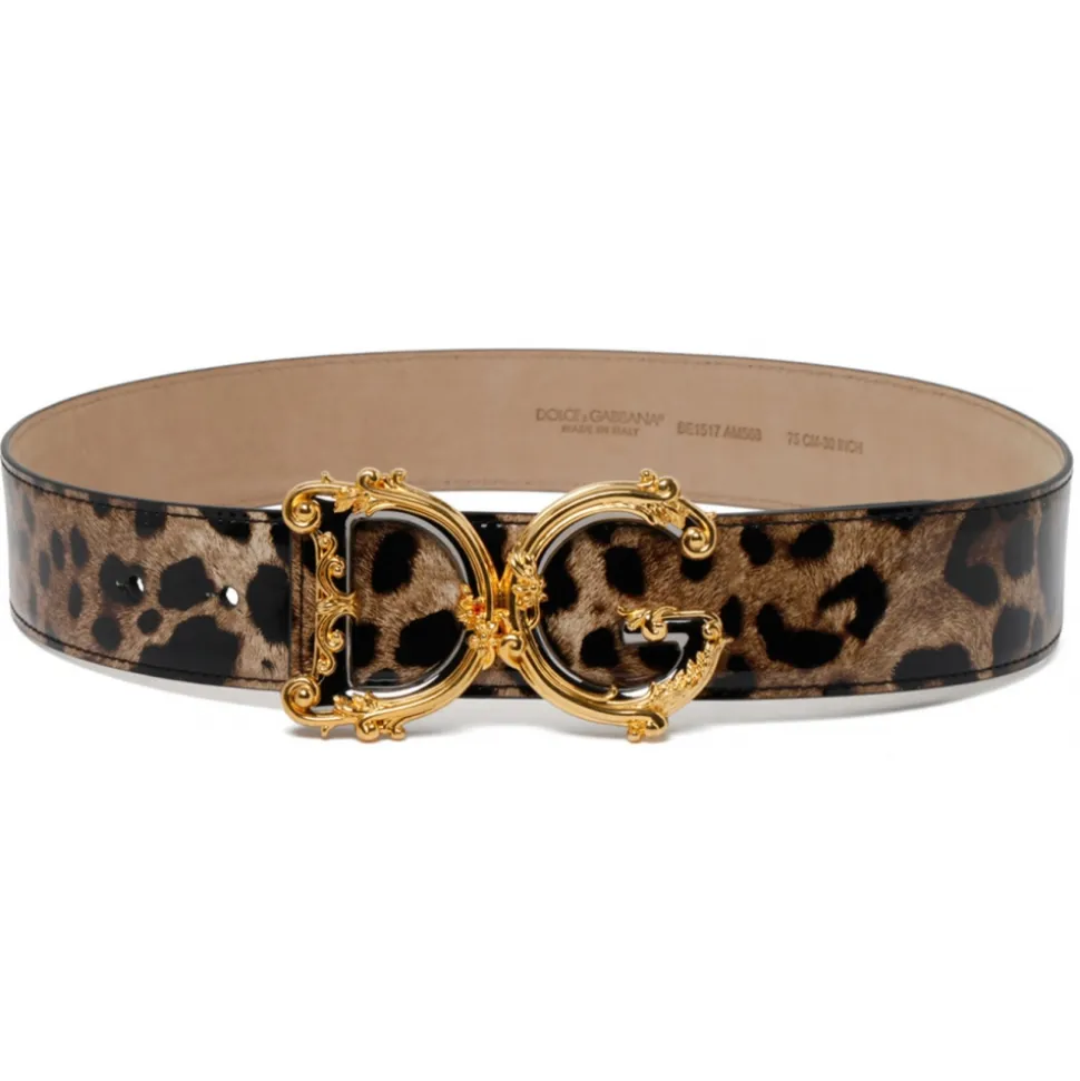 Dolce & Gabbana Camel Brown Calf Leather DG Buckle Belt. Camel brown calf leather belt, glossy finish, all over leopard print, logo embellishment, punched holes, logo buckle fastening, adjustable fit.