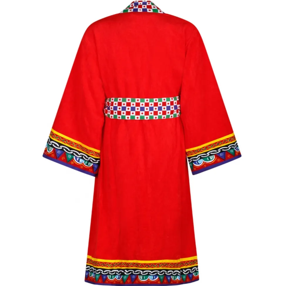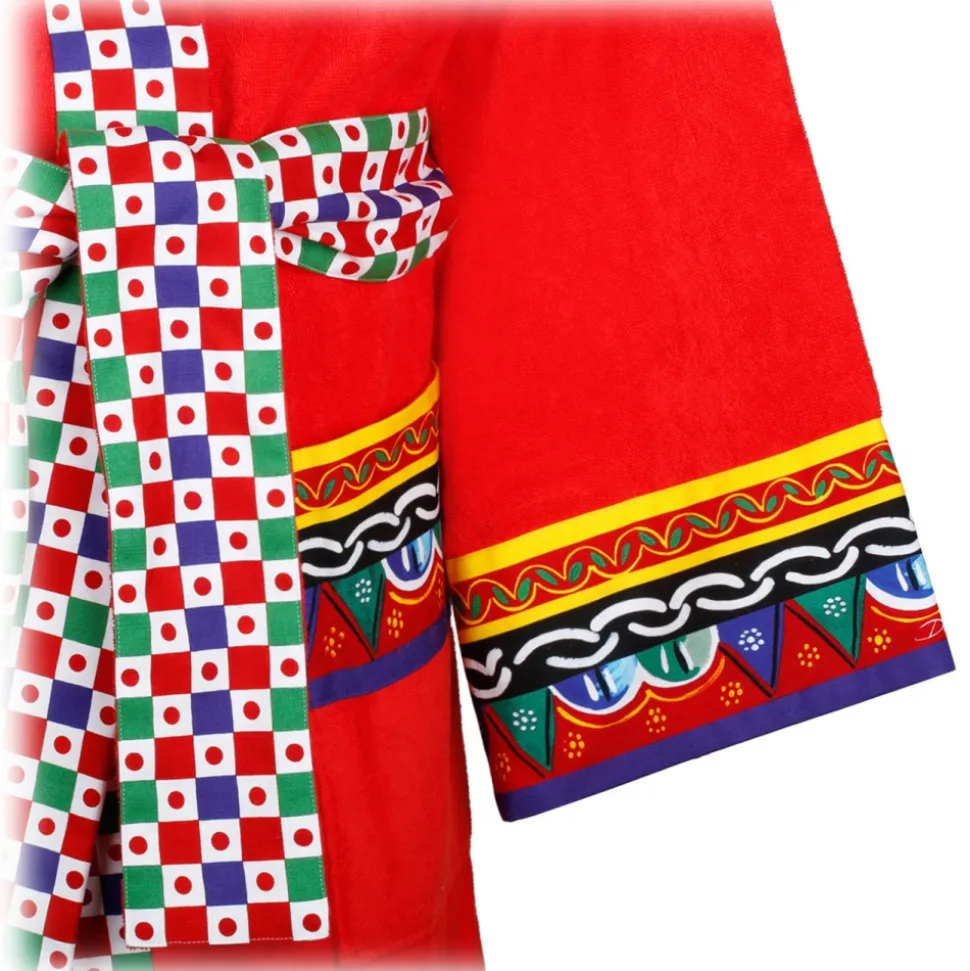 Dolce & Gabbana Carretto Sciliano Printed Trim Bathrobe. Red and multicolour cotton bathrobe, terry cloth effect, folklore inspired Carretto Siciliano design, towelling finish, long sleeves, adjustable waist strap.
