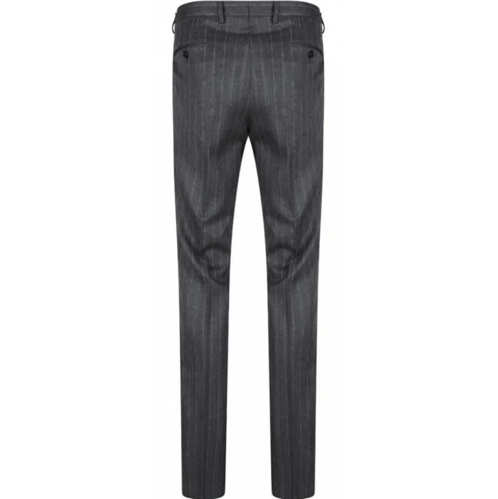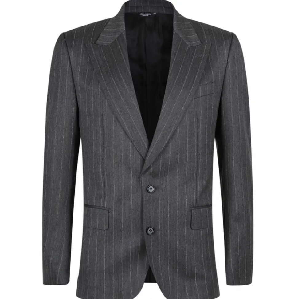 Dolce & Gabbana Striped Suit. Grey virgin wool suit, vertical stripe pattern, peak lapels, long sleeves. Buttoned cuffs, front button fastening, chest welt pockets, two side flap pockets and straight hem.