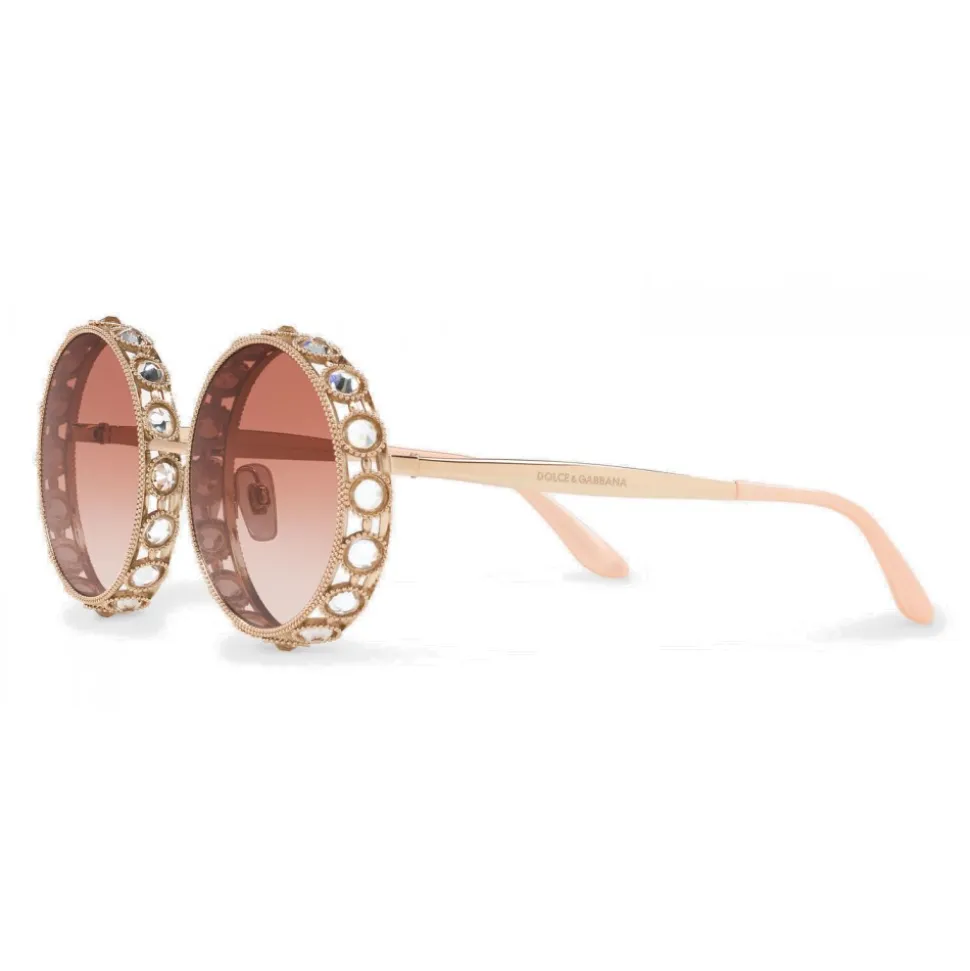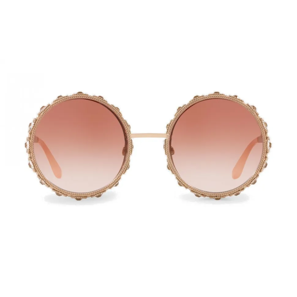 Sunglasses with a round metal shape, handcrafted in a limited edition. The masterpiece is characterized by a metal structure adorned with gold-colored pearls, while the profile of the lenses is enriched with 32 crystals with a precious diamond cut. The temples are personalized with the Dolce & Gabbana logo. It is presented in a luxurious case and case covered with fabric with a Mambo print and is accompanied by a golden metal card that certifies the Limited Edition.