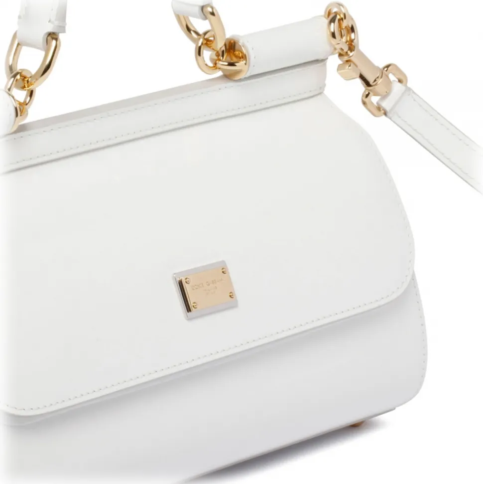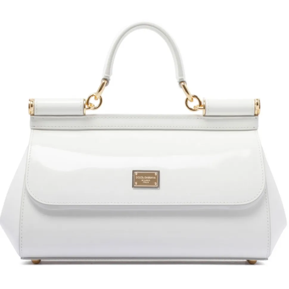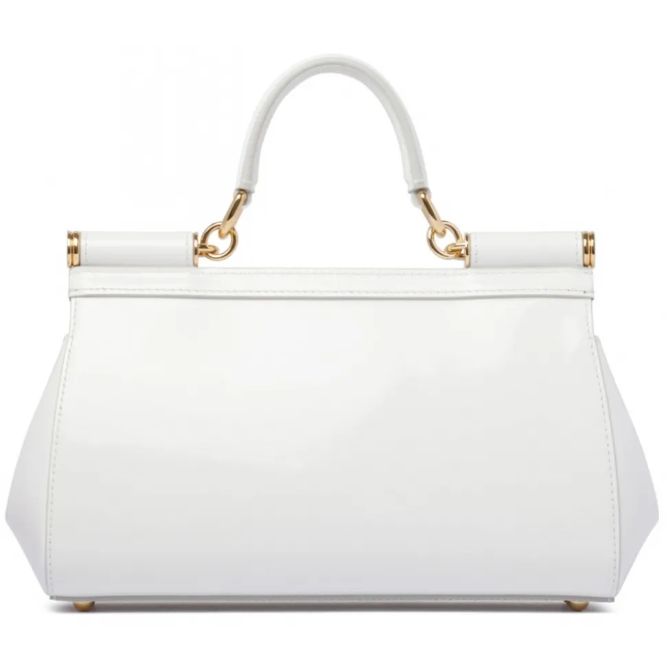 Dolce & Gabbana Sicily Elongated Handbag. White Sicily elongated handbag in shiny calfskin, front flap with hidden double magnet closure, bigalvanic logo tag. Top handle and adjustable and removable shoulder strap in shiny calfskin and fabric lining and flat pocket.