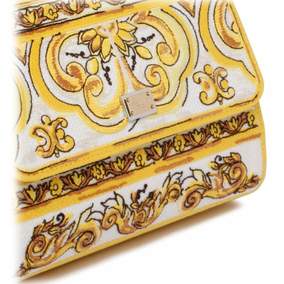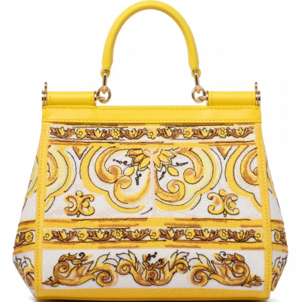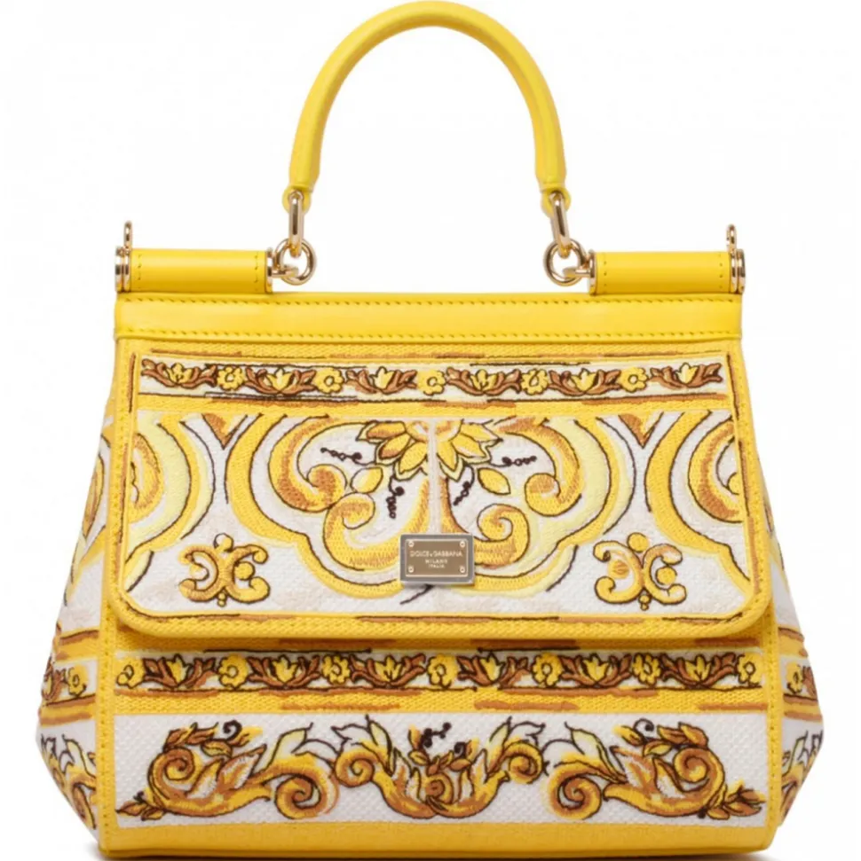 Dolce & Gabbana Sicily Medium Handbag. Sicily medium handbag with thread-embroidered Maiolica pattern. Yellow and white colours, front flap with hidden double magnet closure. Bigalvanic logo tag, top handle and adjustable and removable calfskin shoulder strap. Fabric lining and internal pocket and credit card slot.