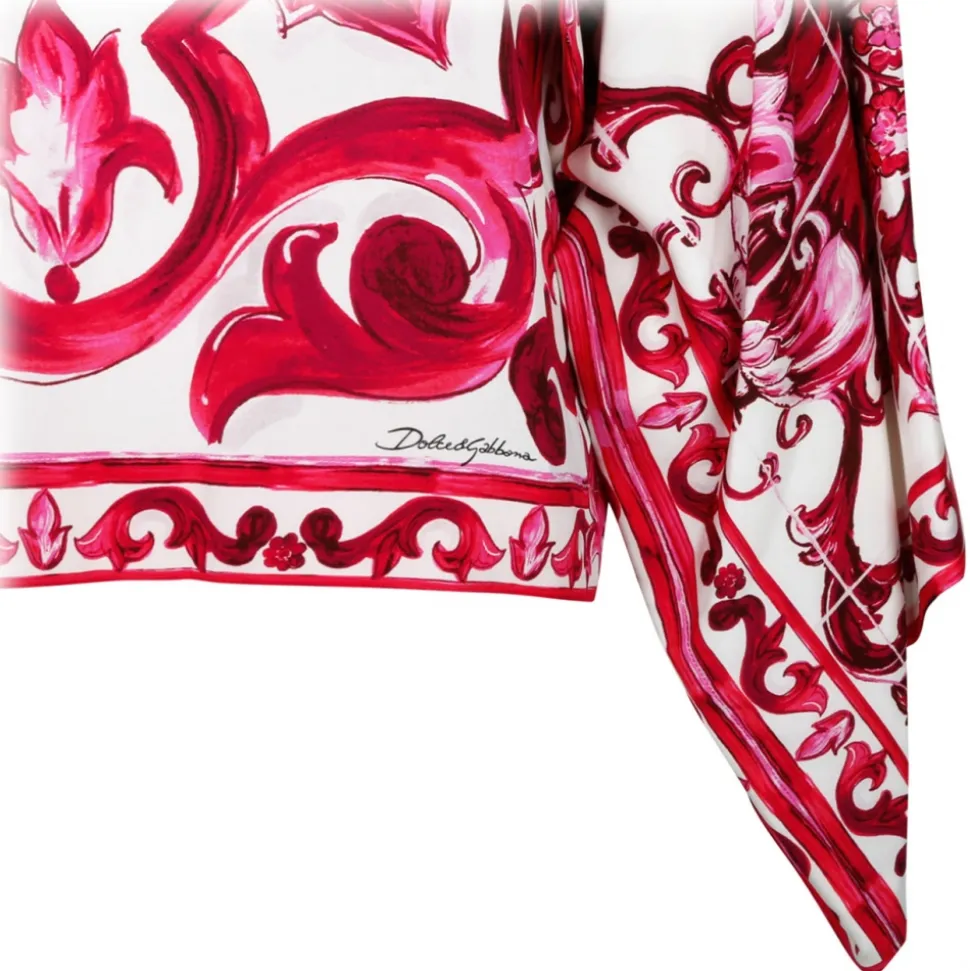 Dolce & Gabbana White, Red and Pink Silk Majolica Print Blouse. White, red and pink silk blouse, all over Majolica print, slash neck, long sleeves and straight hem.
