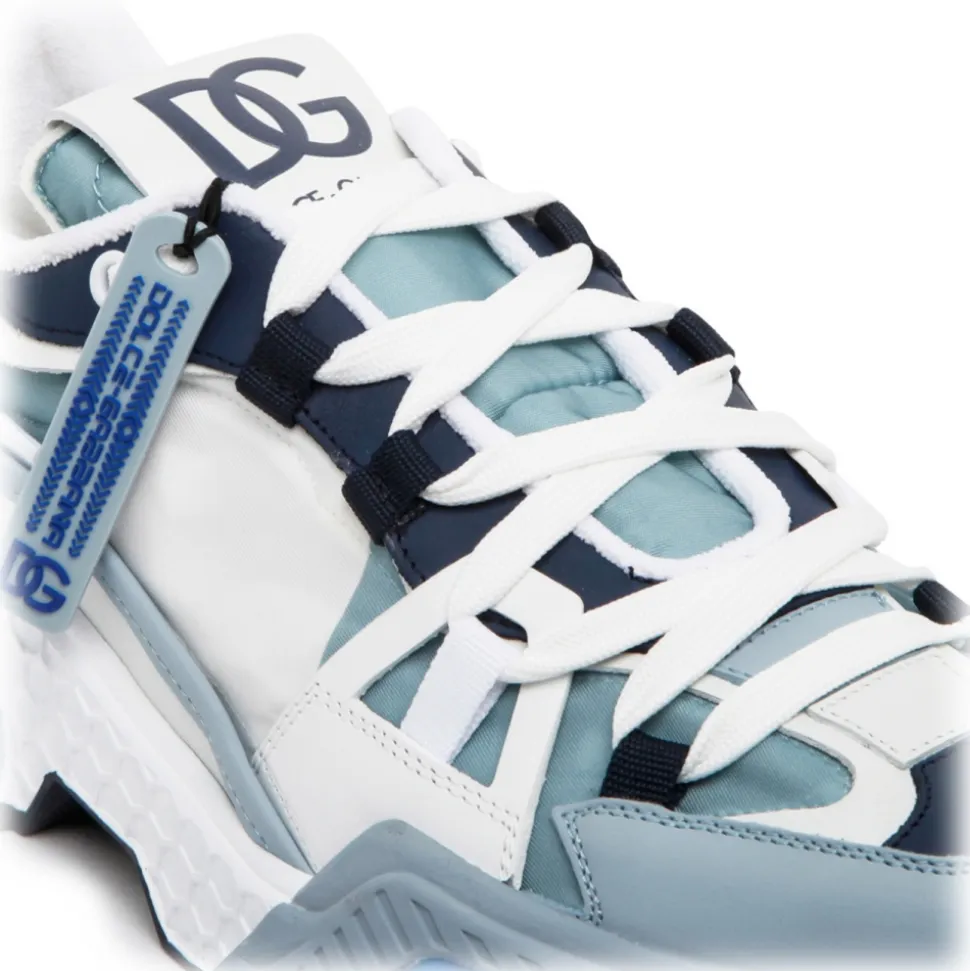 Dolce & Gabbana Sky Blue and Multicolour Calf Leather Airmaster Low Top Sneakers. Sky blue and multicolour calf leather low top sneakers, colour block design, front lace up fastening. Logo patch at the tongue, branded insole, branded heel counter, round toe, chunky rubber sole.