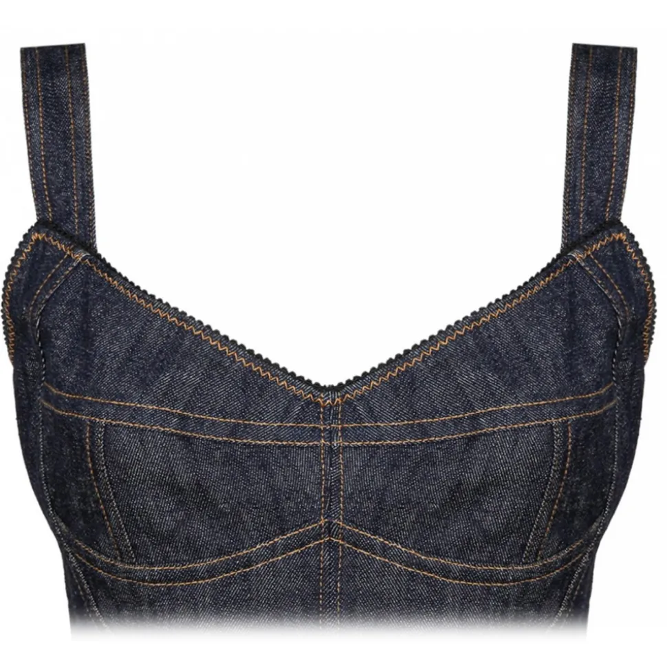 Dolce & Gabbana Stretch Design Denim Dress with logo plaque at waist, square uncovered scarf, bustier style neckline, back zipper closure. Sleeveless.