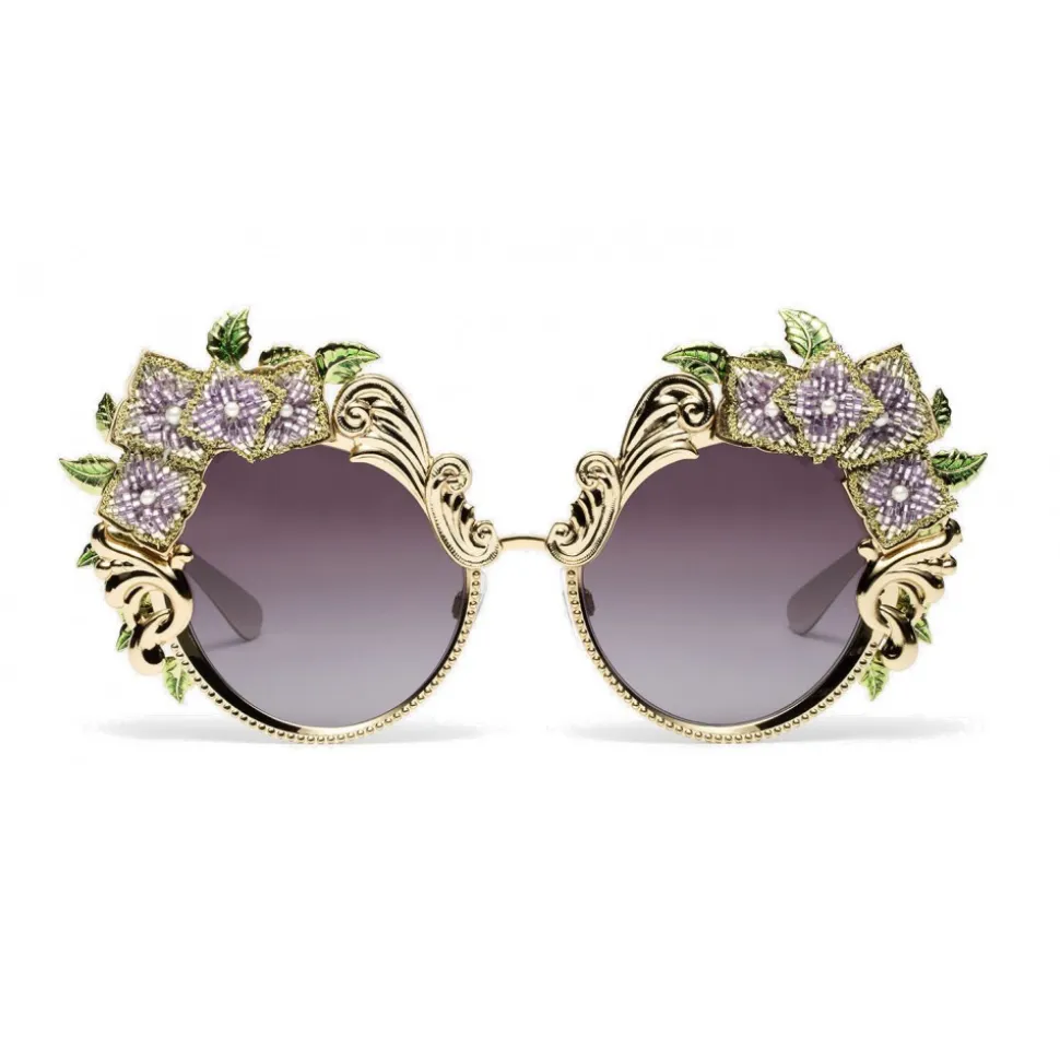 Sunglasses in metal with a round shape embellished with gold baroque swirls, flowers composed of small beads and handmade leaves. The temples, personalized with the Dolce & Gabbana logo, are embellished with gold color details.