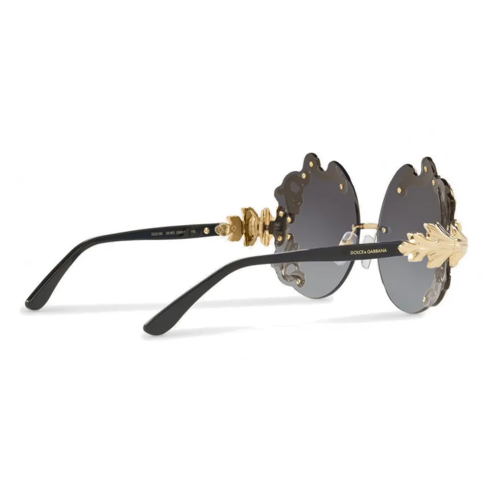 Exclusive sunglass embellished by the stylish cut of shaded black lenses and baroque gold-colored metal applications. Comfort is guaranteed by adjustable nose pads.