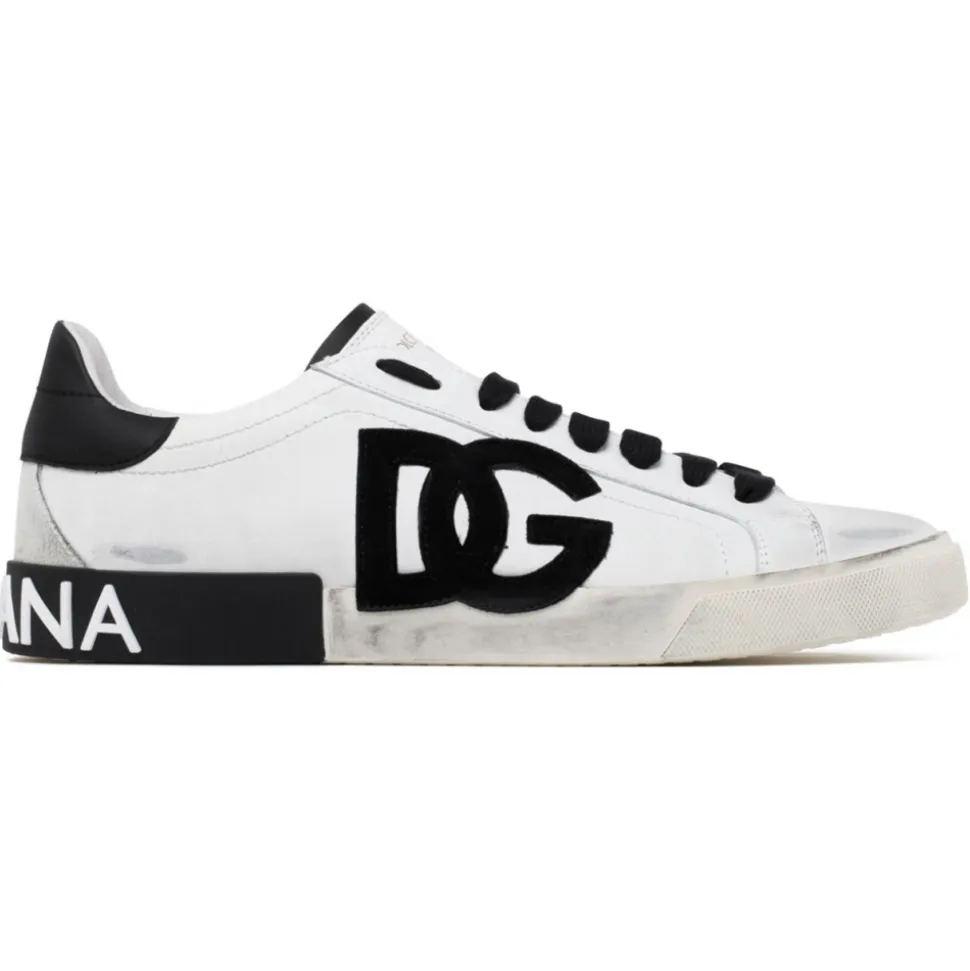 Dolce & Gabbana White and Black Calf Leather Portofino Low Top Sneakers. White and black calf leather sneakers, distressed effect, logo patch to the side, logo embossed tongue, rubberised logo detail, front lace up fastening round toe, branded insole, flat rubber sole.