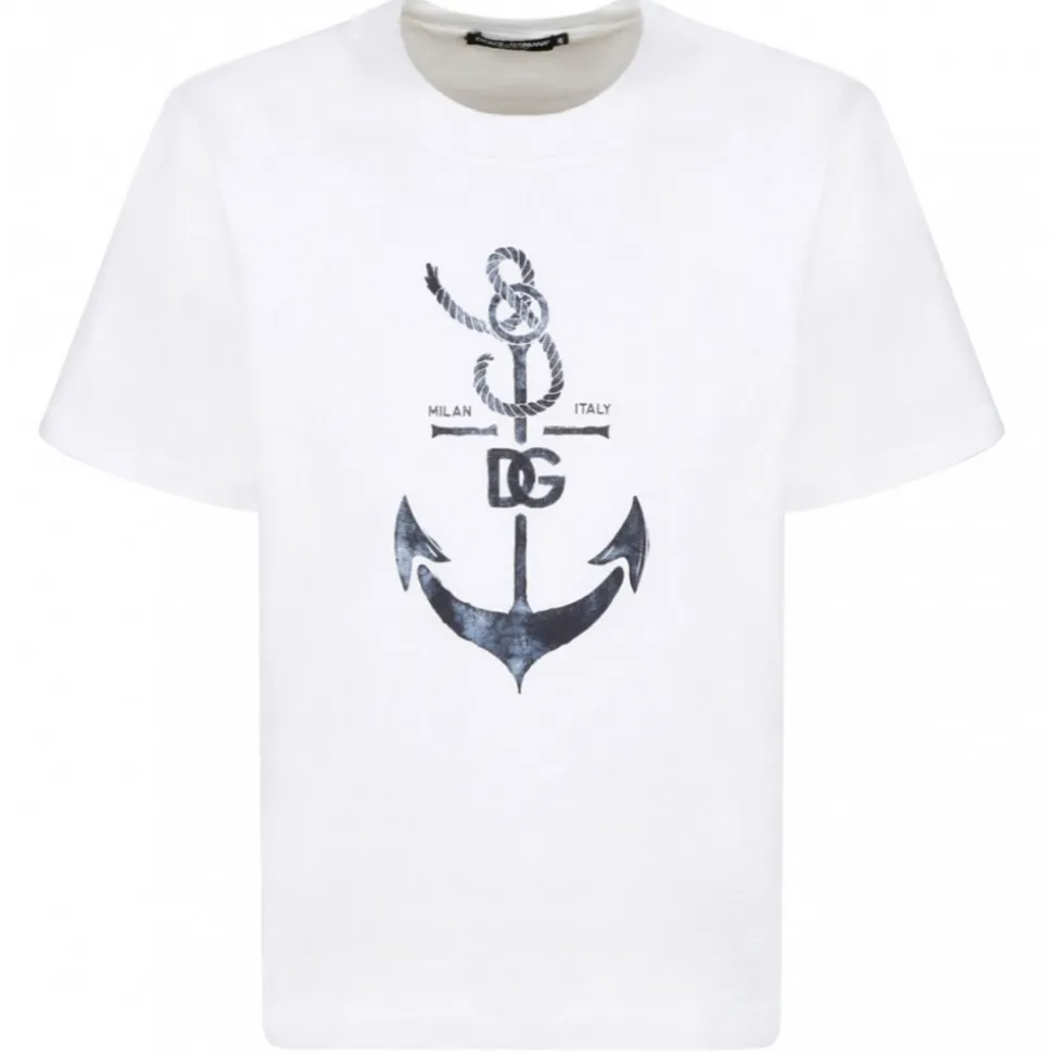 Dolce&Gabbana White Cotton T-Shirt With Print. Round neckline and short sleeves. Print with anchor and blue logo on the front.