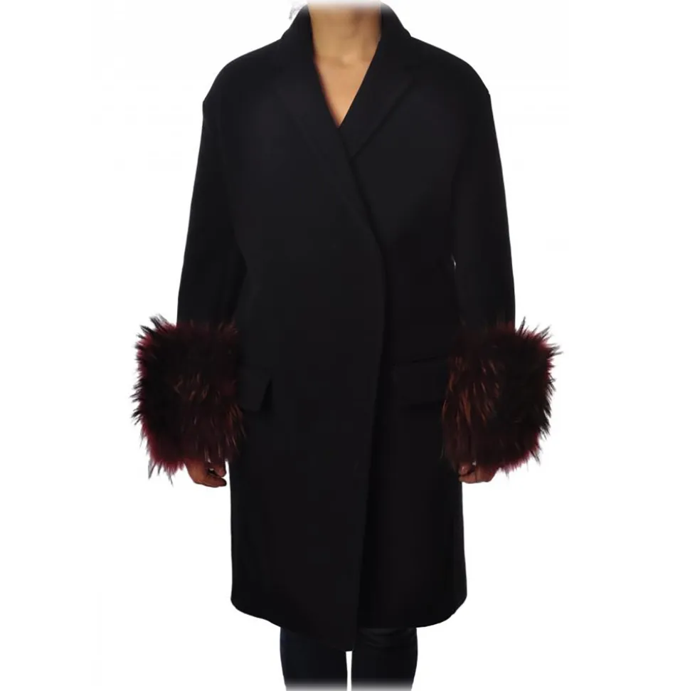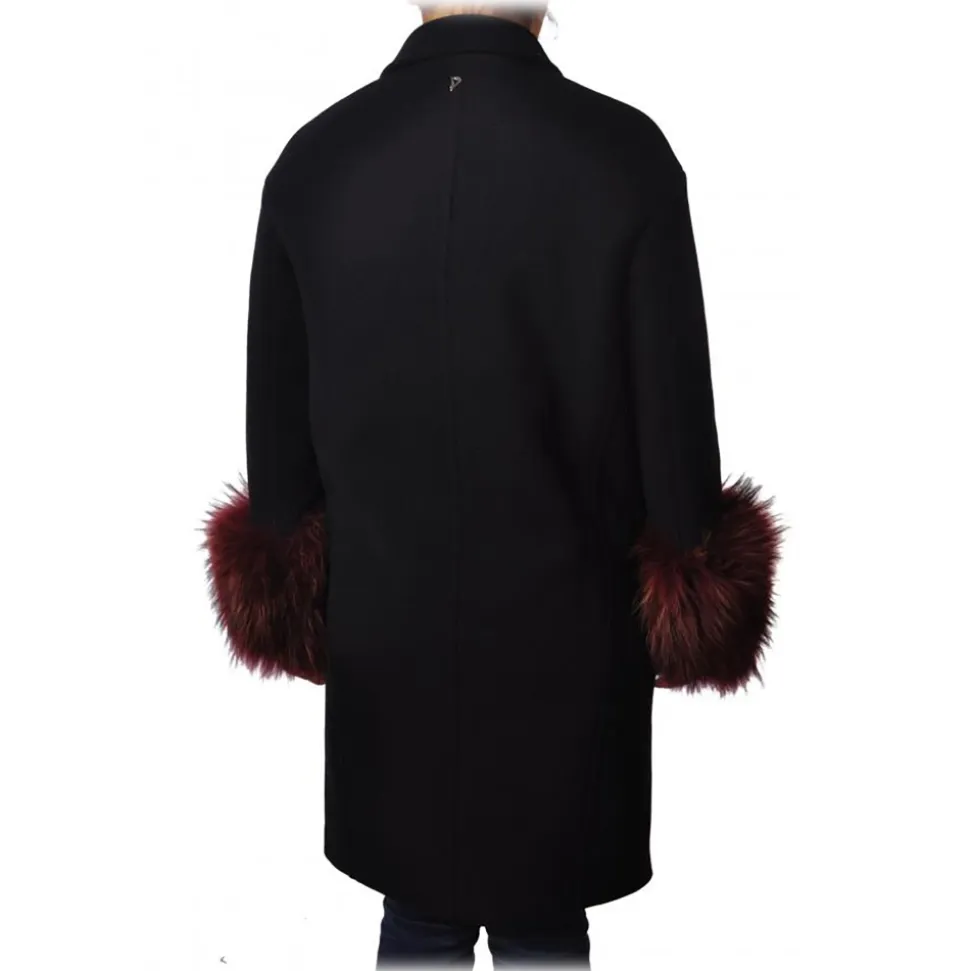Dondup coat, broad egg-shaped model, with double-breasted concealed fastening, two flap pockets, and contrasting coloured fur cuffs.