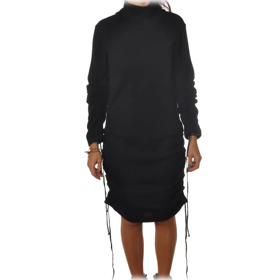 Dondup dress, long-sleeved sheath model, with thread draping on the sleeves and side, made of mesh fabric.