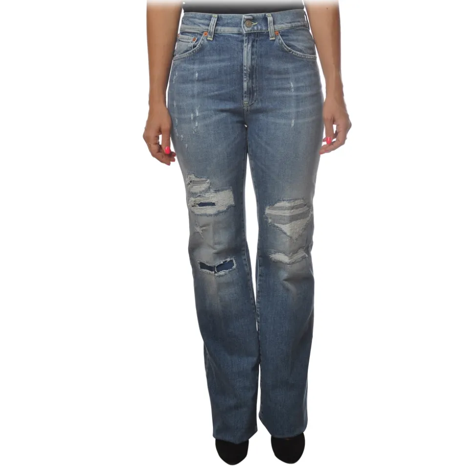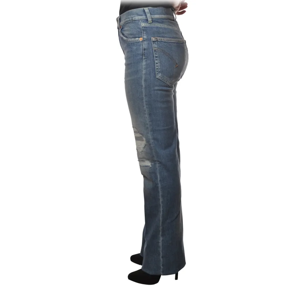 Dondup jeans, high-waisted Mabel model with five pockets and straight leg, made of faded denim canvas with some breaks.