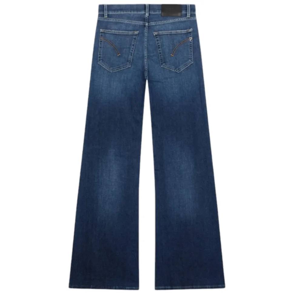 Dondup jeans, five-pocket model, wide leg with regular waist. In left hand blue stretch denim, medium clean wash and logo.