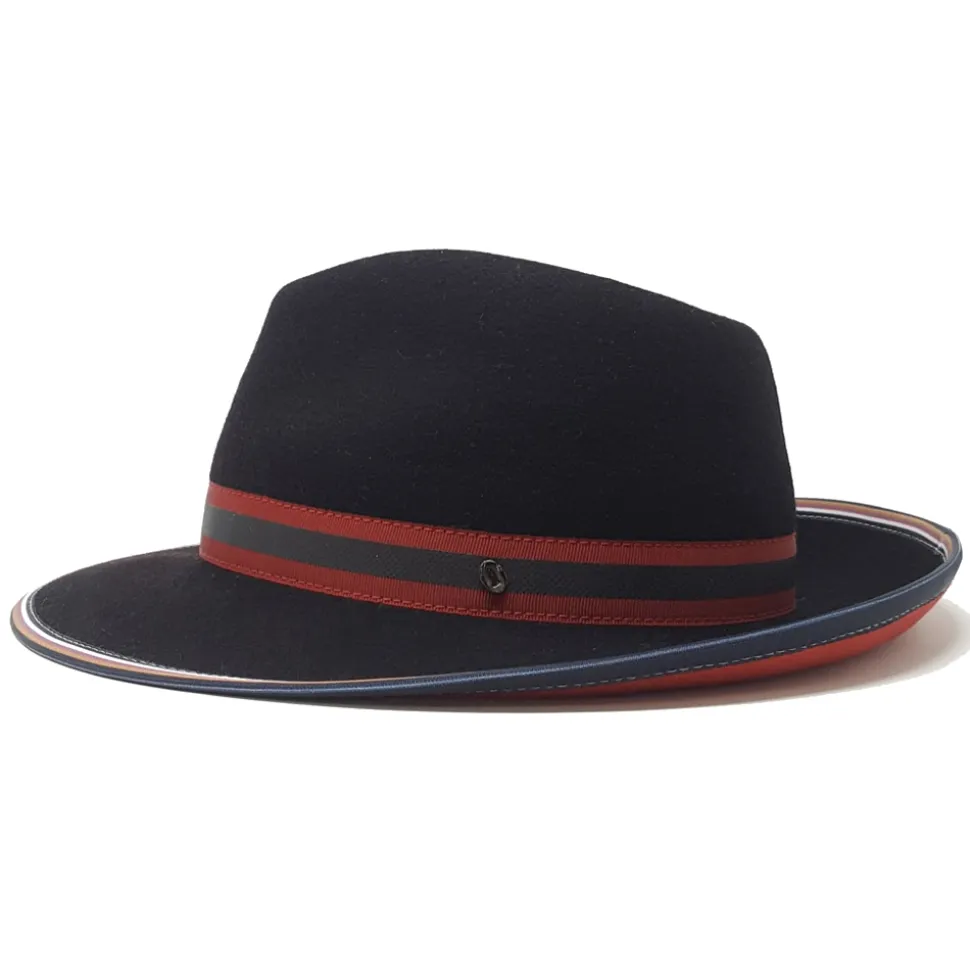 Felt Fedora hat in saraceno black color decorated with under-brim in lace red color and rubbered band in black color. A practical and light hat.