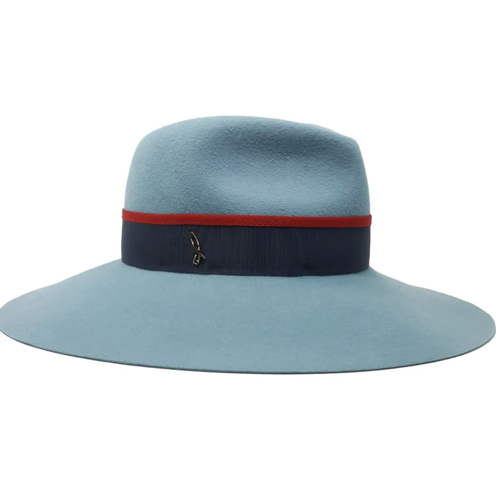 Lapin felt large brim drop hat in lagoon color decorated with simple Gros grain band in scarab color and profiles in laque red color. An elegant and classical hat.