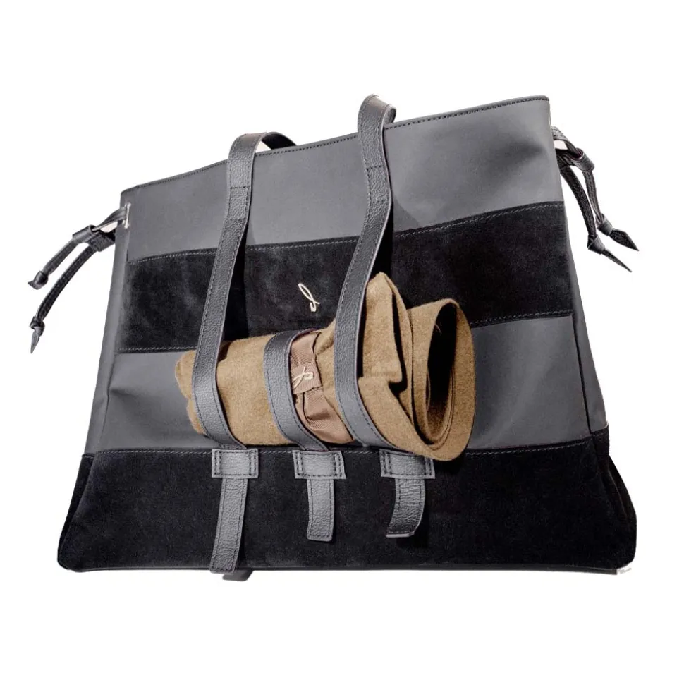 Suede leather and rubberized fabric Hat-Bag Shopper in black color. The shopper proposes a classic with its straps to fix the rolled-up hat on the front, as in the suitcases of end-of-800 travelers. Indispensable everyday life companion and for short trips.