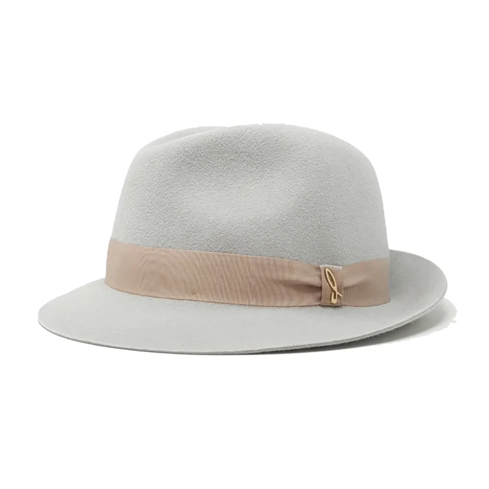 Velour felt trilby hat in pearl color decorated with a Gros grain band in travertine color. A trendy and British hat.