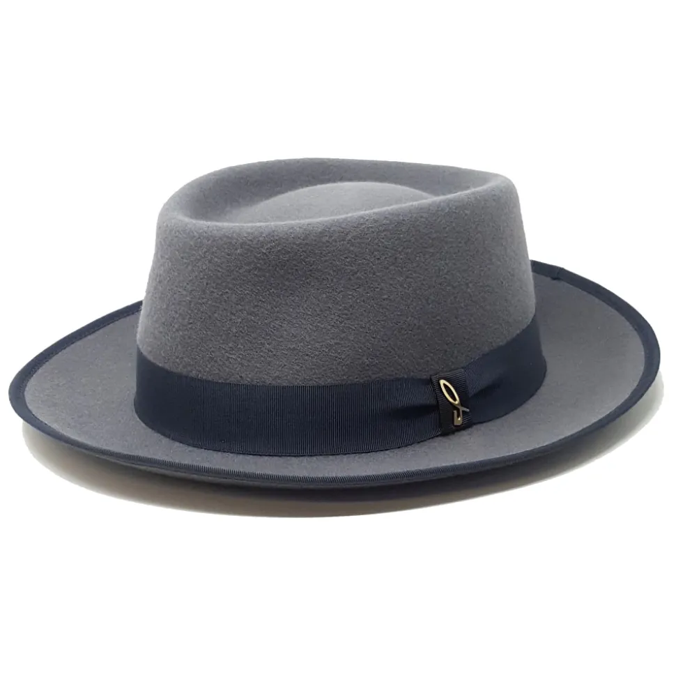 Wool felt “open drop” hat in pearl color decorated with a Gros grain band in scarab color. A vintage and jazz hat that gives to your look a dandy touch.