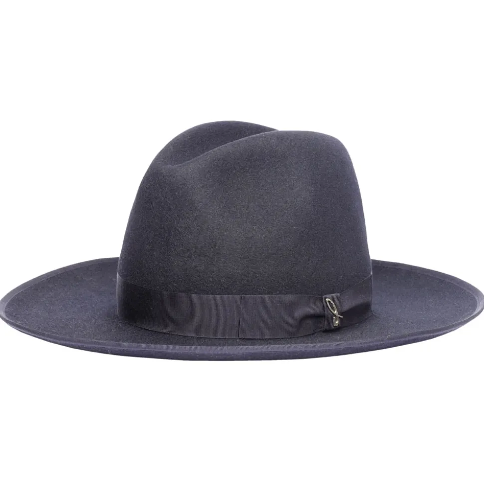 Smooth felt “snap” hat with high crown and large brim. Matching band and binding.