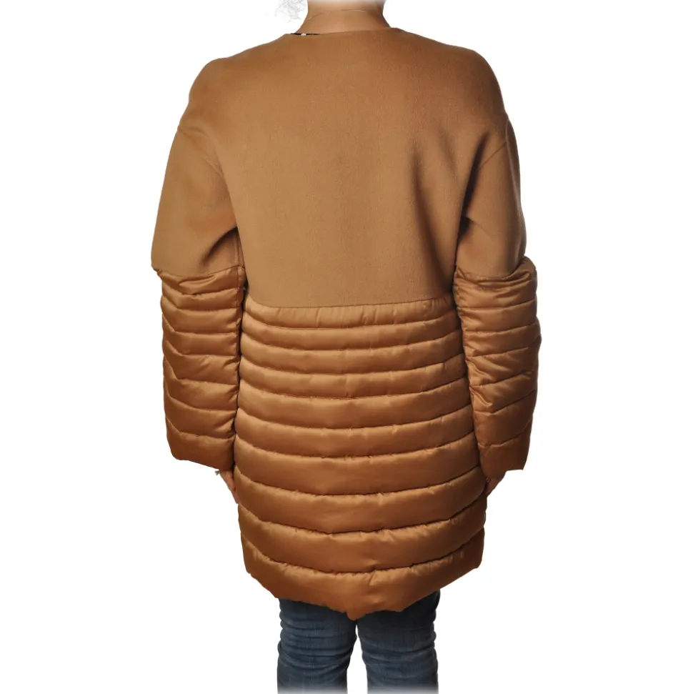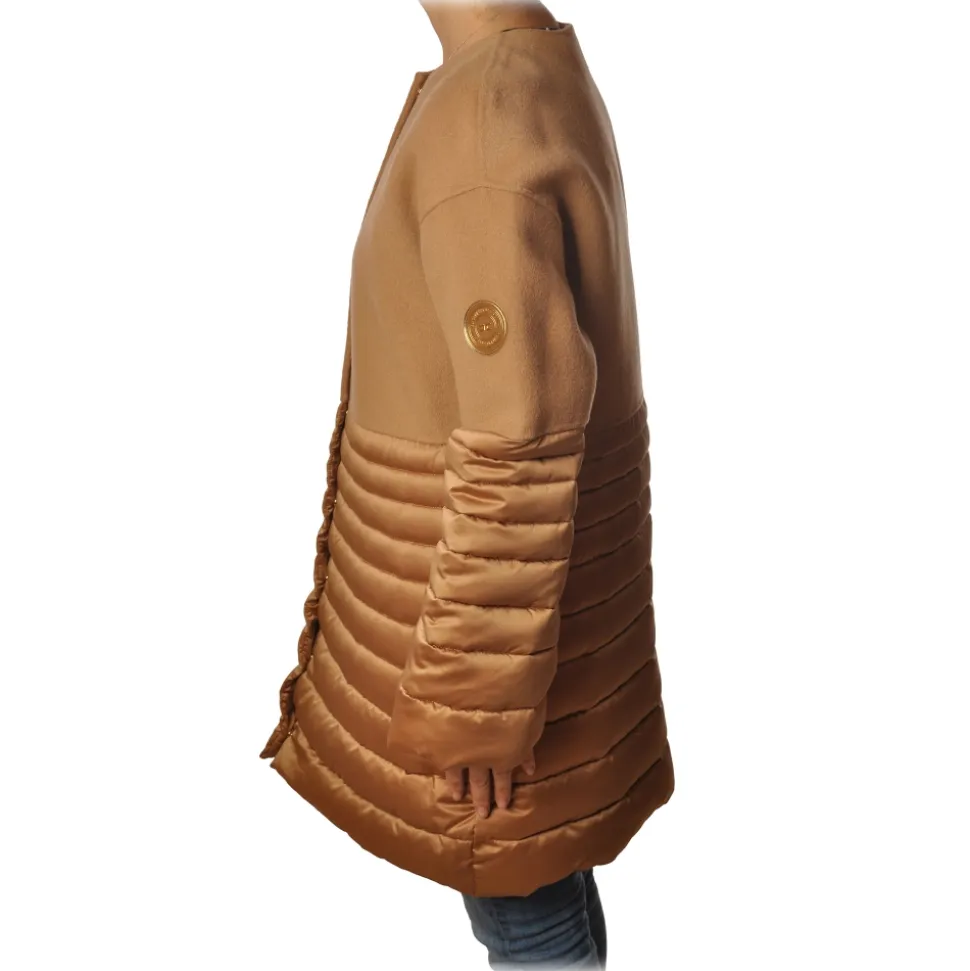 Elisabetta Franchi coat, chanel model with 3/4 length, long and flared sleeves, above in cloth fabric and below in eco-friendly down jacket, covered clip closure.